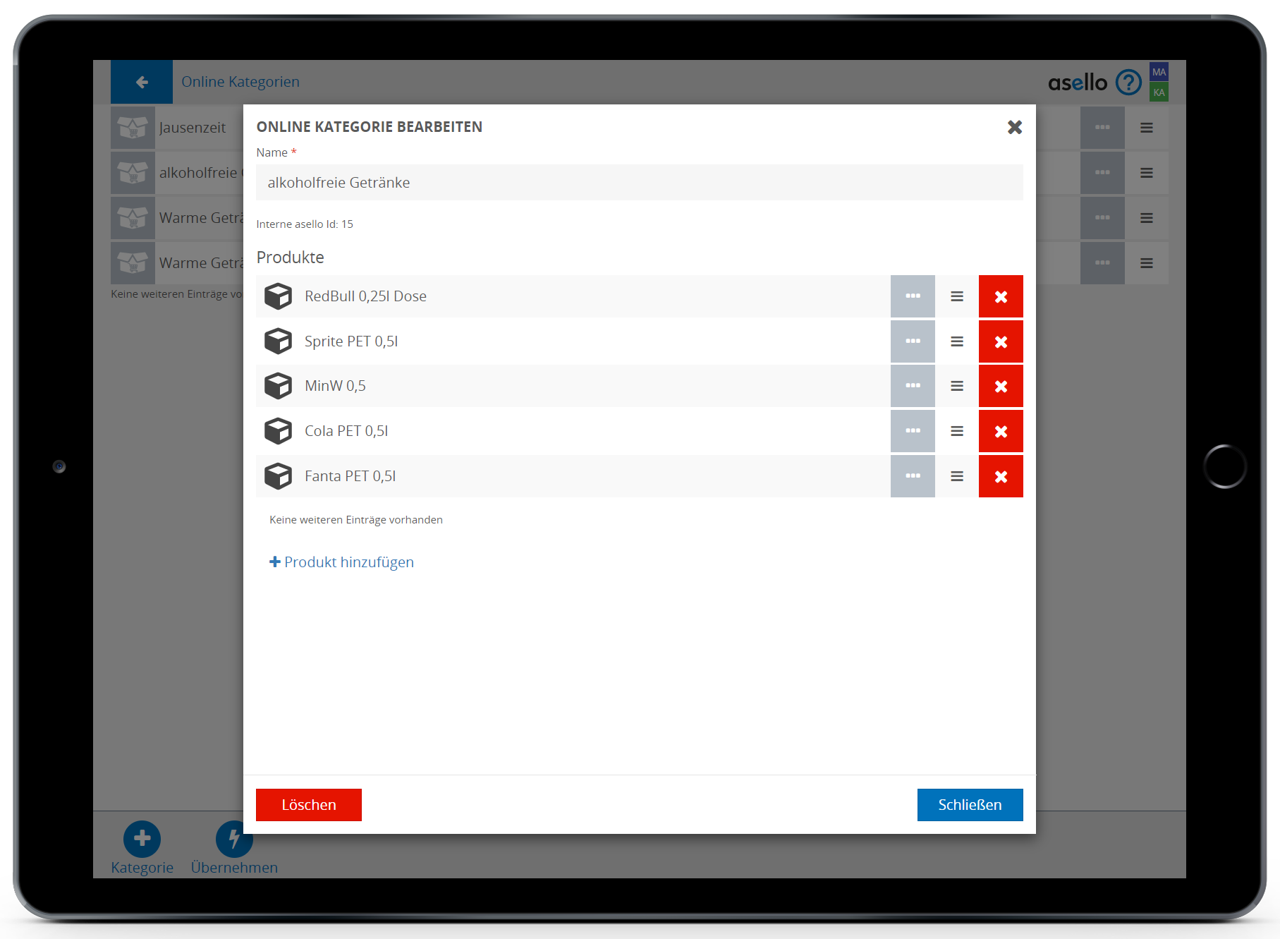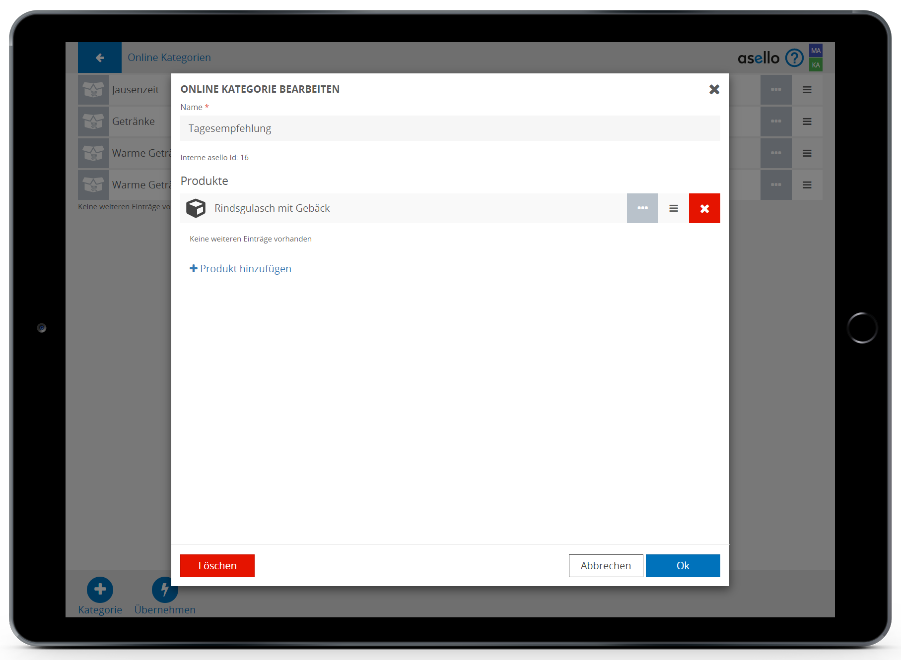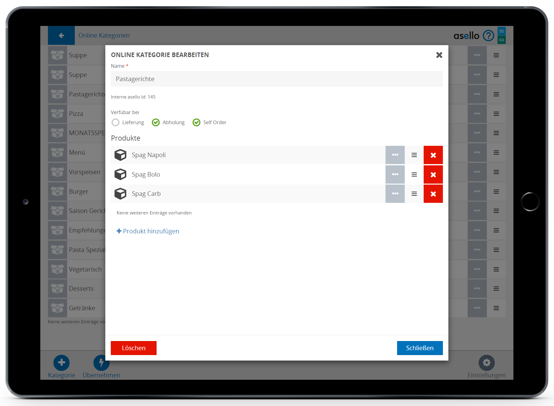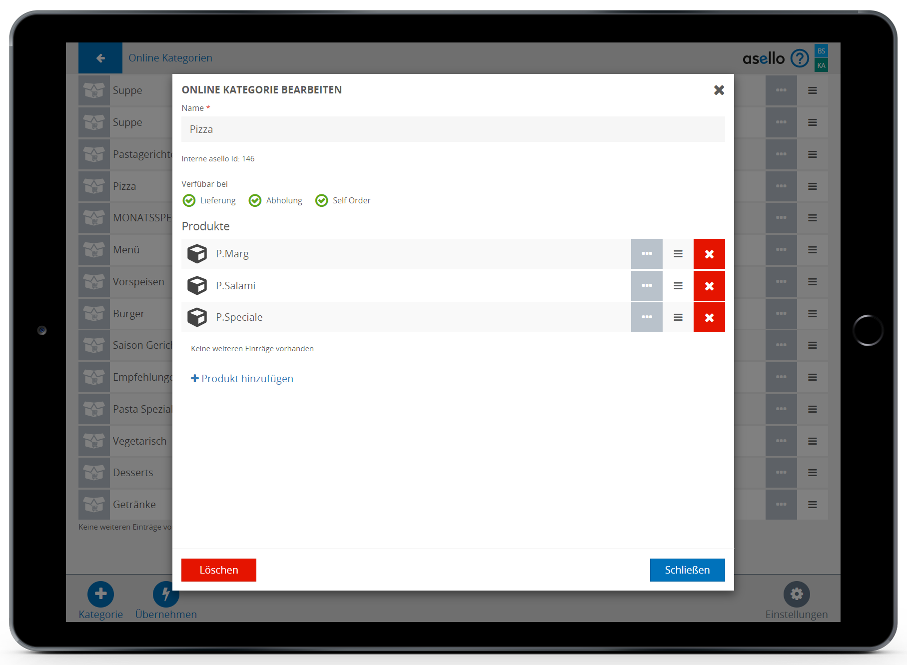 Hier können Sie den Namen der Online Kategorie bearbeiten, einzelne Produkte hinzufügen oder löschen und die Reihenfolge der Produkte im Lieferservice verändern. Ziehen Sie dazu das Produkt durch Drücken und Halten des Symbols mit den drei Strichen am Ende der Zeile, an die gewünschte Position.