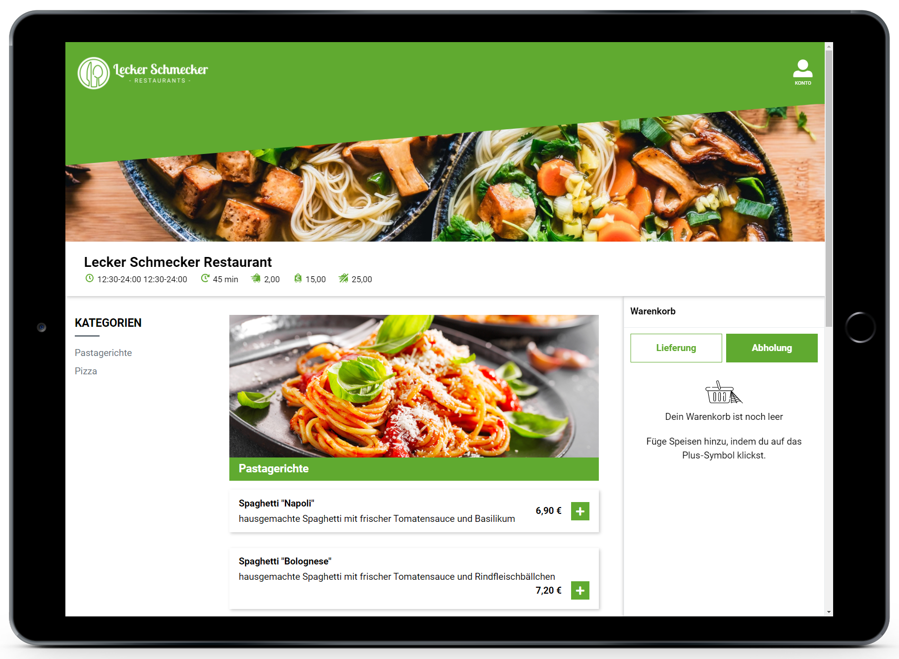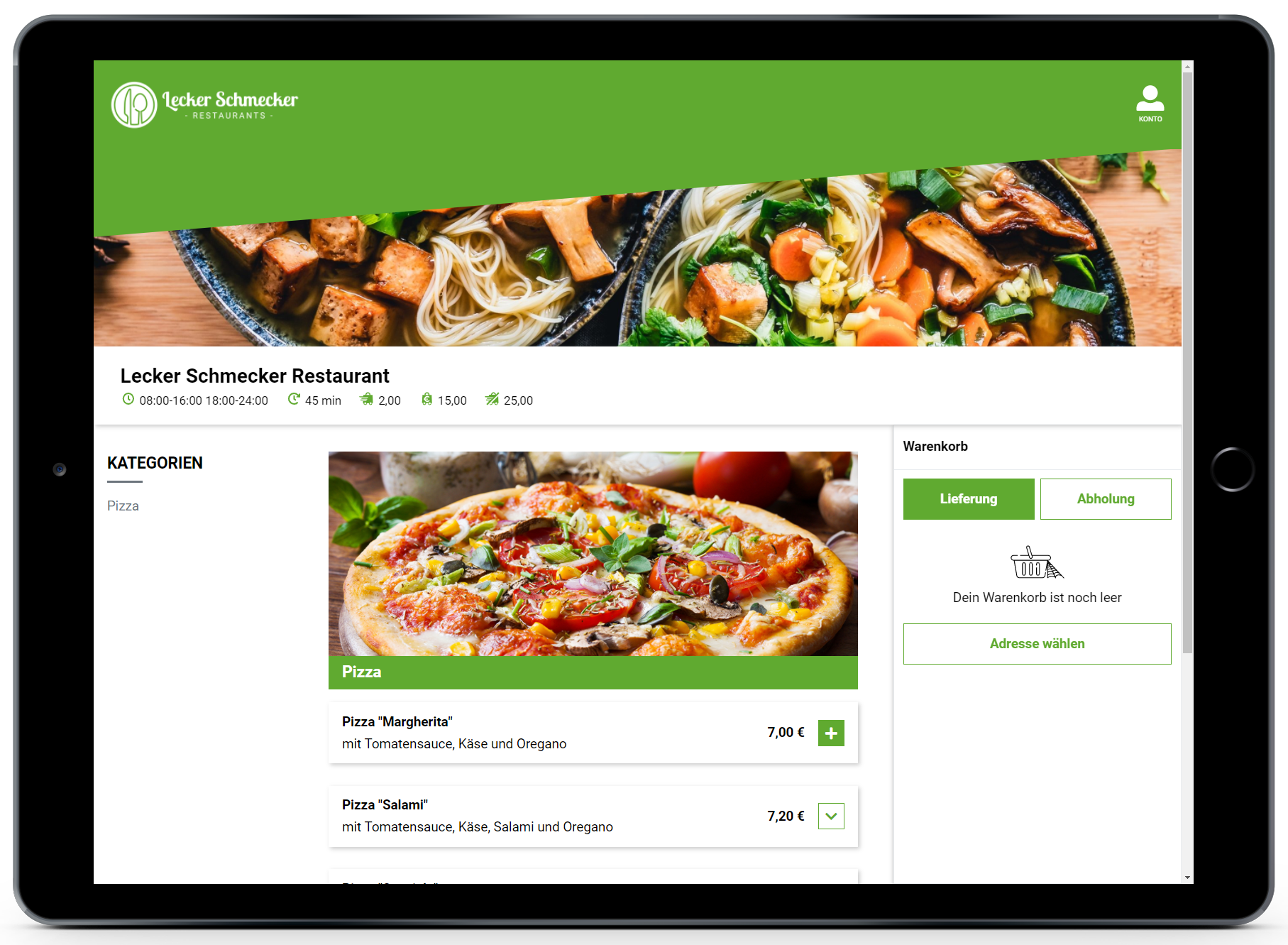 Für eine Abholung stehen in diesem Beispiel die Online Kategorien "Pizza" und "Pastagerichte" zur Verfügung.