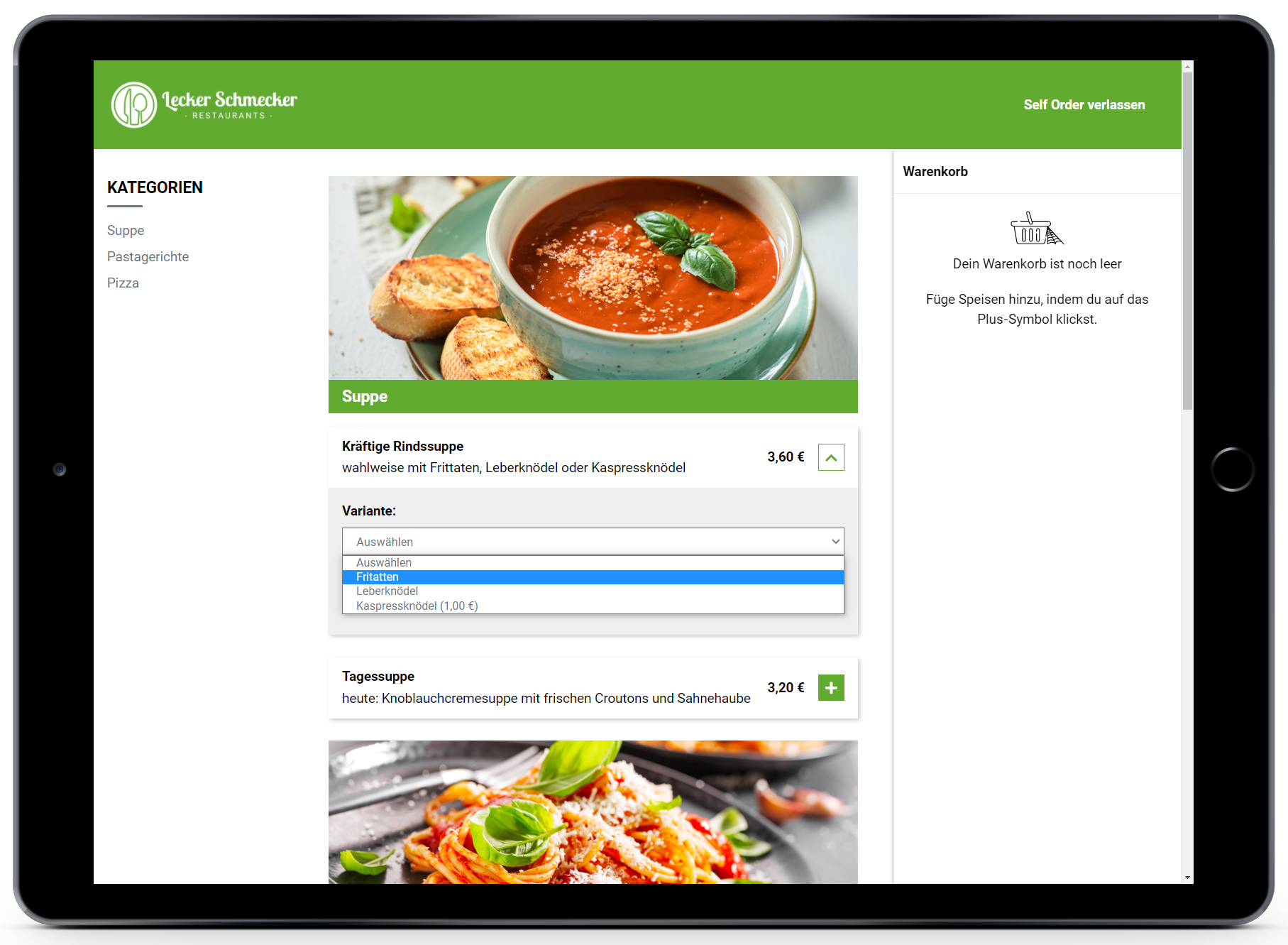 Für eine Self Order Bestellung stehen in diesem Beispiel die Online Kategorien "Pizza", "Pastagerichte" und "Suppe" zur Verfügung.