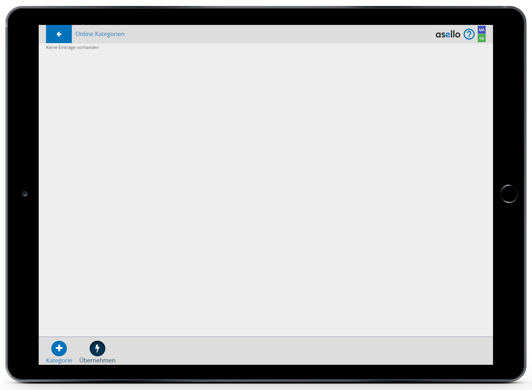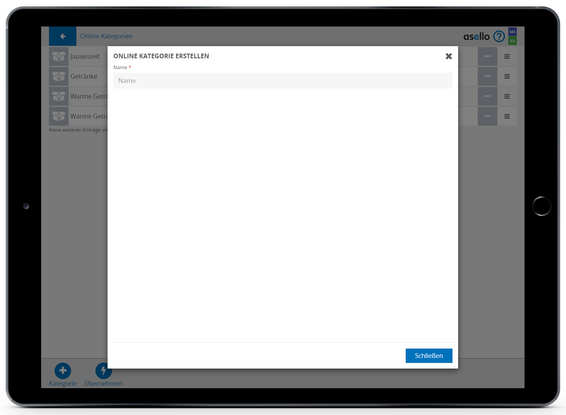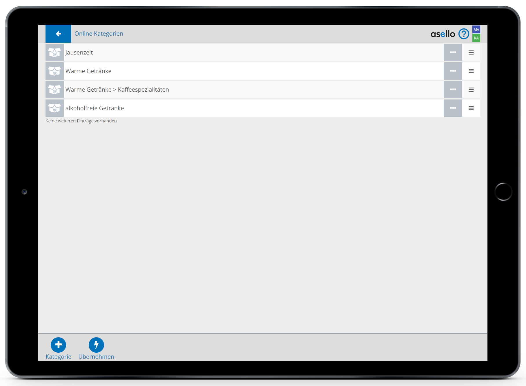 Unter „Online Kategorien“ können eigene Kategorien für den Lieferservice erstellt werden. Die Bezeichnung dieser Kategorien wird Online als Kategorie Titel angezeigt. Klicken Sie auf das „Blitz“-Symbol mit der Bezeichnung „Übernehmen“ am linken unteren Bildschirmrand, um Ihre bestehenden Produktgruppen zu den Online-Kategorien hinzuzufügen.