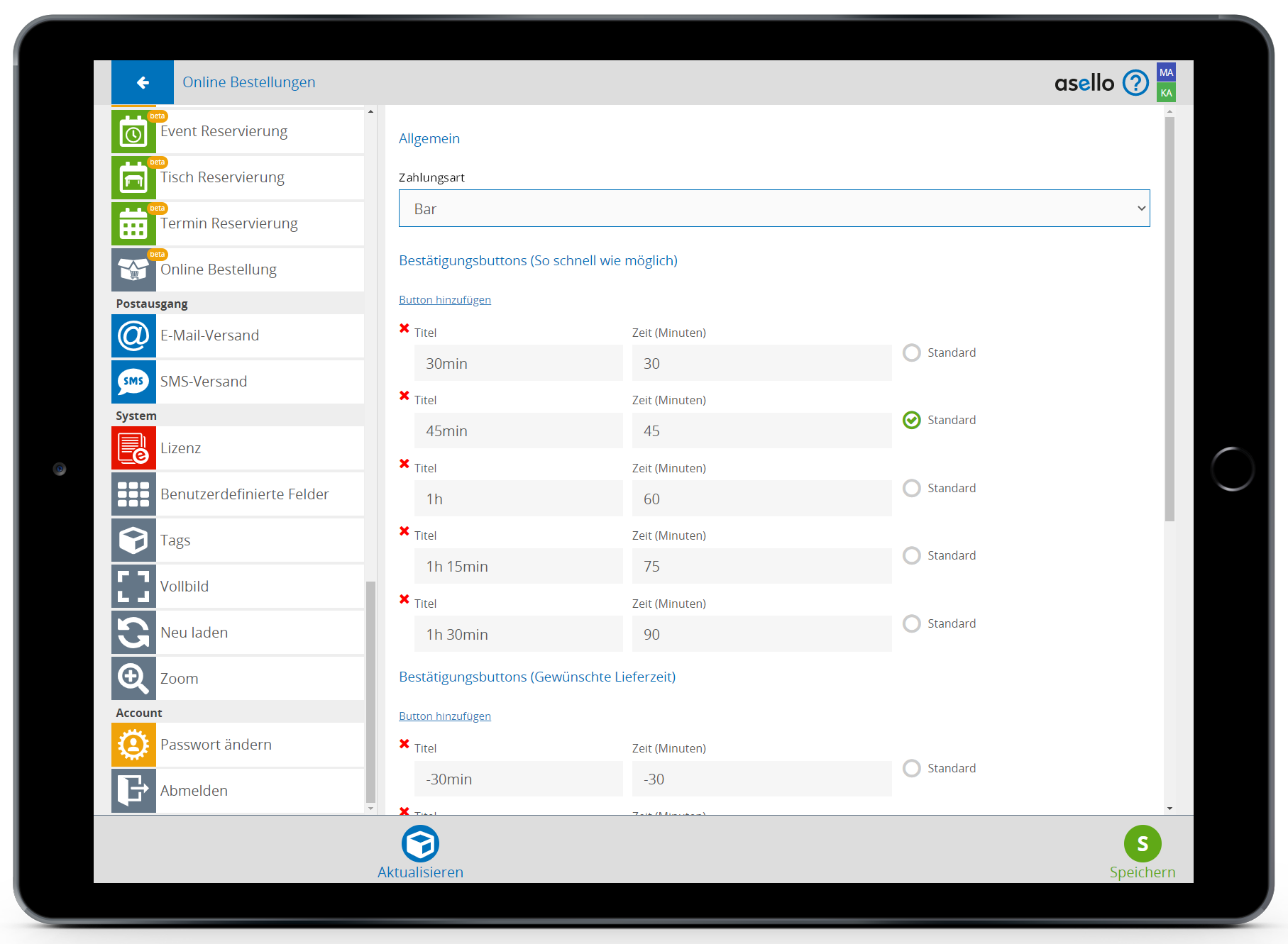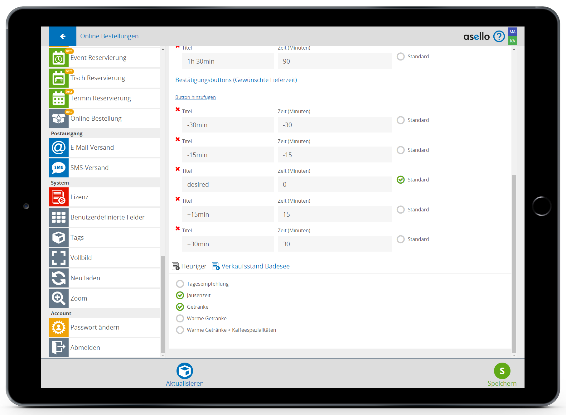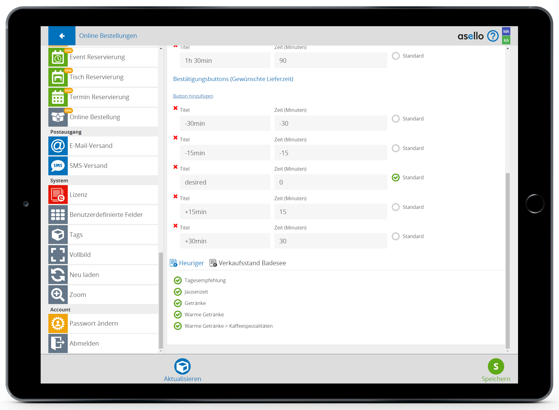Haben Sie Ihre Einstellungen gemacht klicken Sie rechts unten auf Speichern und danach links auf Aktualisieren. Damit werden die Einstellungen mit dem Lieferservice synchronisiert.