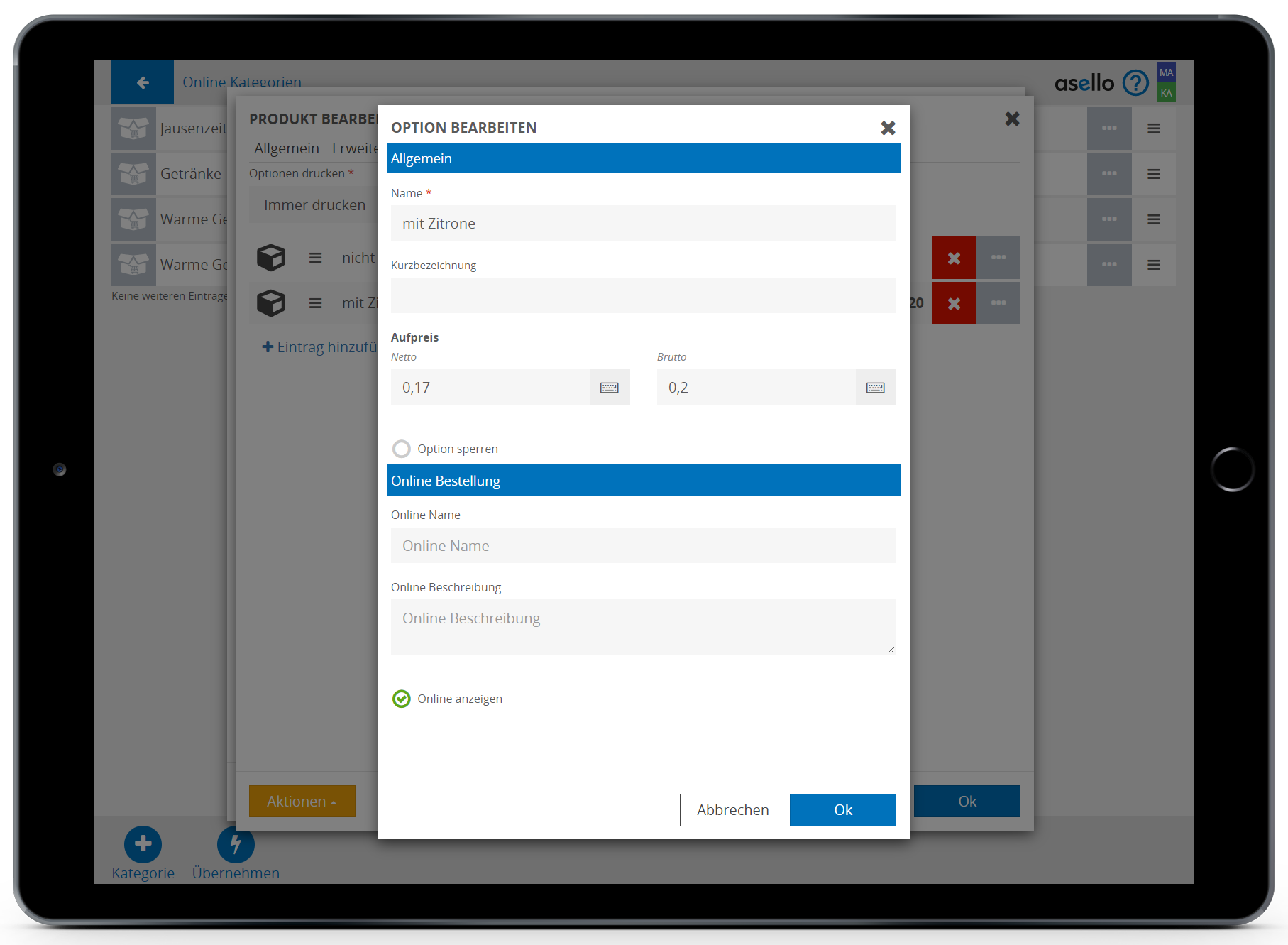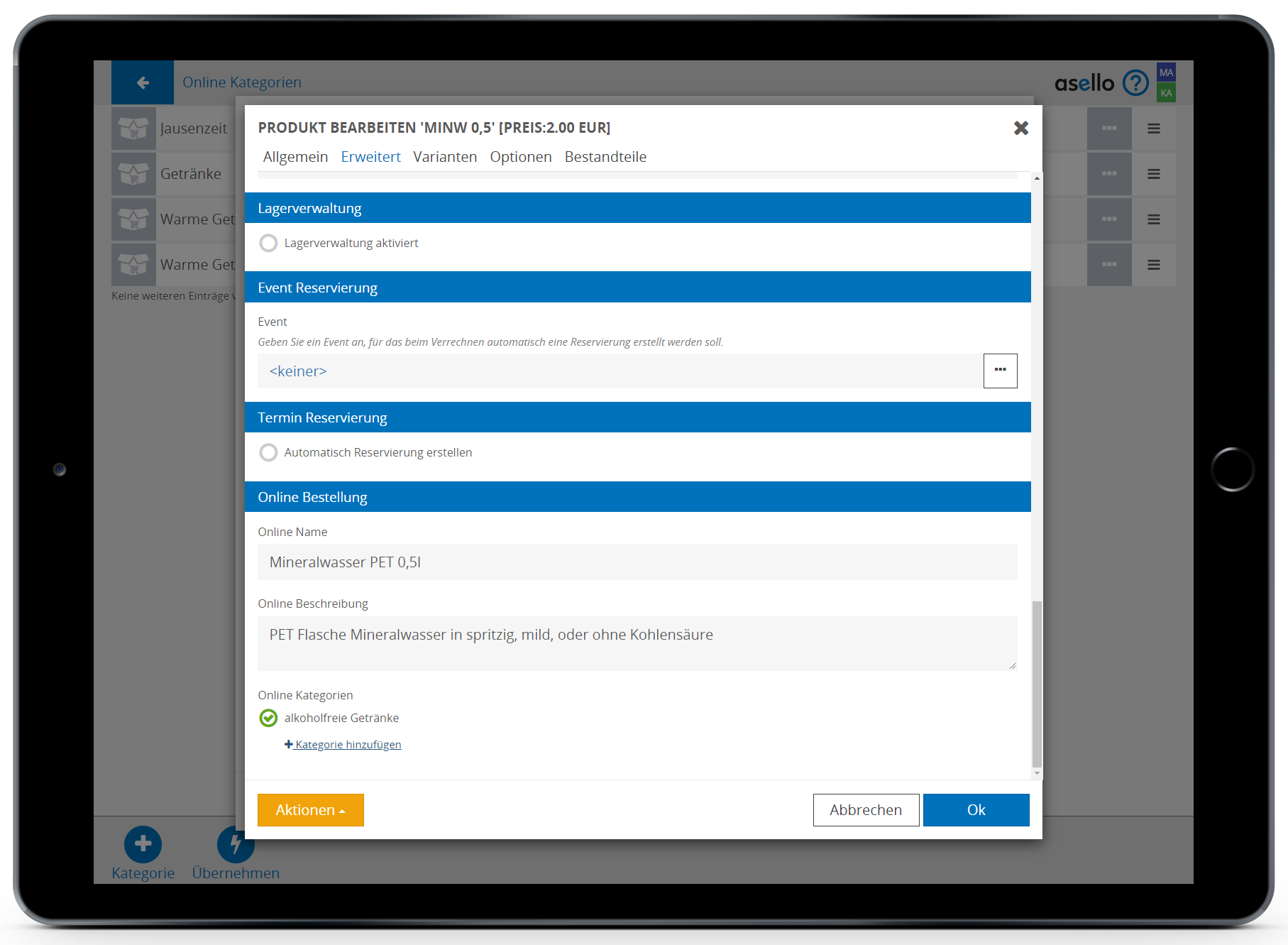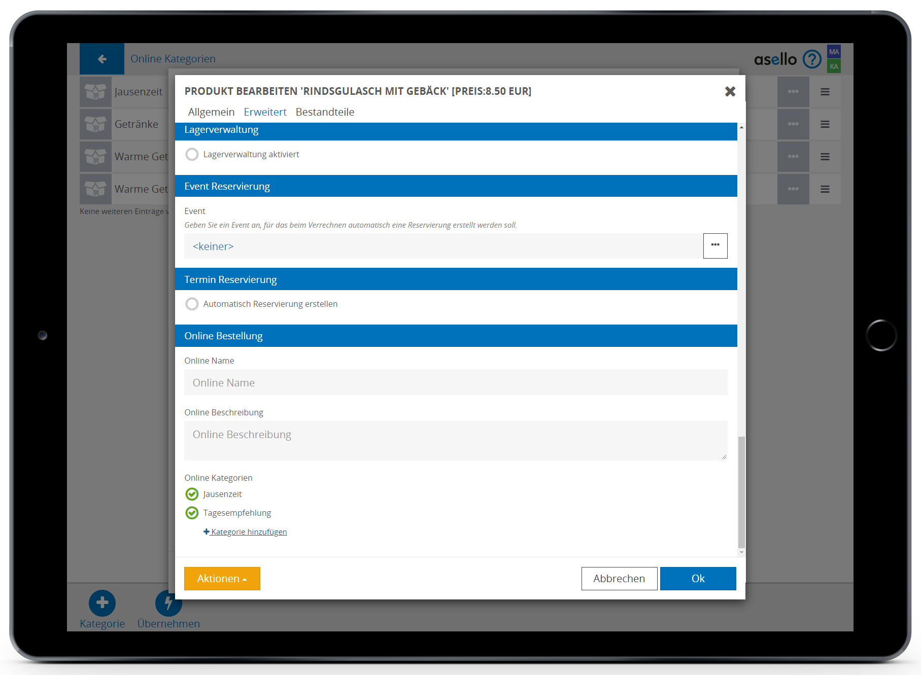 Sie können durch Klicken auf ein Produkt, dieses bearbeiten und ihm im Register „Erweitert“ unter „Online Bestellung“ einen eigenen Online Namen und eine Online Beschreibung geben. Hier können Sie außerdem ein Produkt zu mehreren Online Kategorien hinzufügen.