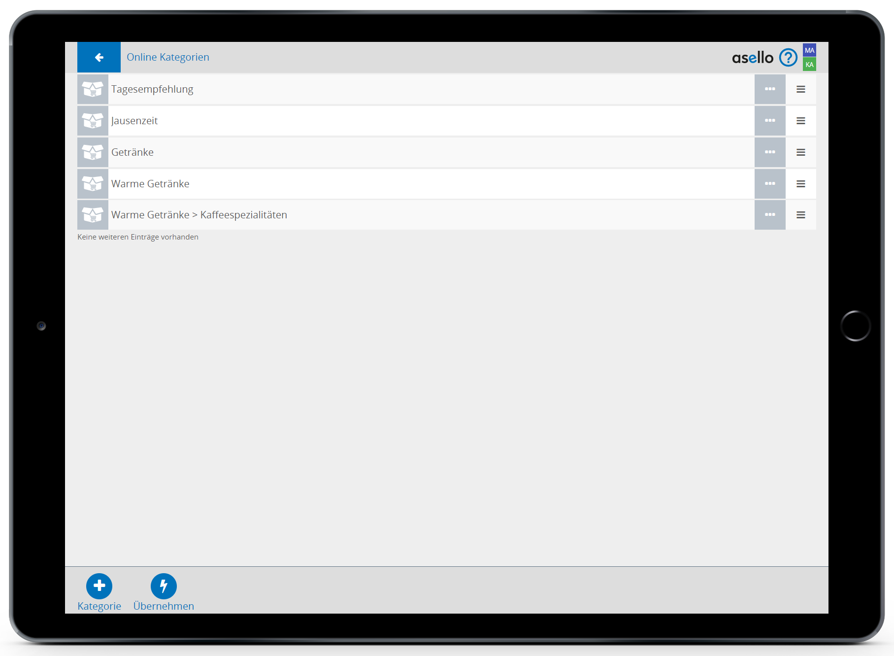 Die Reihenfolge der Kategorien kann mithilfe des Symbols rechts in der Produktzeile geändert werden. Klicken und halten Sie dazu die drei Striche und ziehen Sie die Kategorie an die gewünschte Stelle. Die Sortierung der Online Kategorien wird für den Lieferservice übernommen.