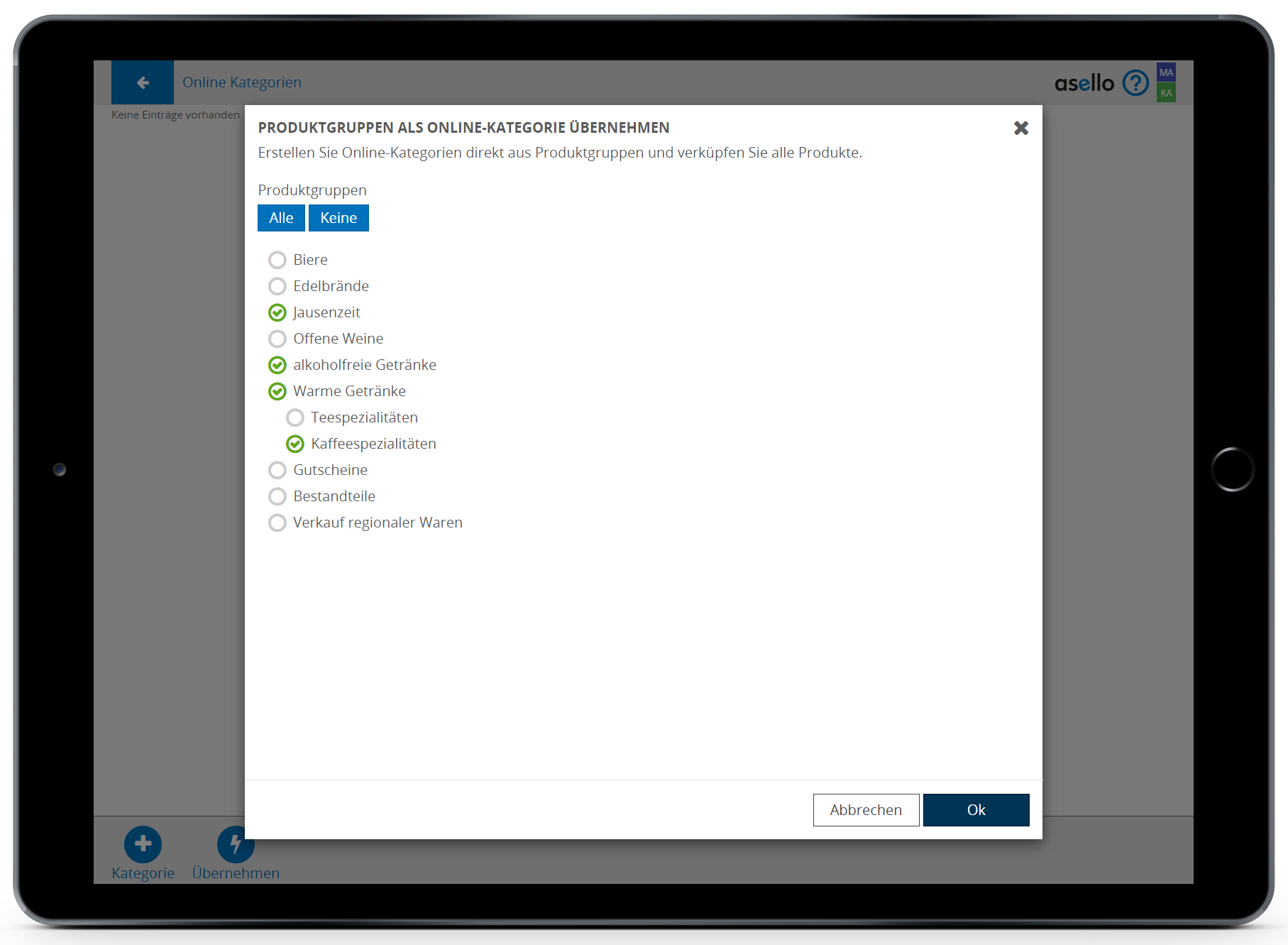 Es öffnet sich ein Fenster, in dem Sie die gewünschten Produktgruppen und Unterproduktgruppen auswählen und einen Online Kategorie Titel hinzufügen können. Mit Klick auf „Ok“ werden die gewählten Produktgruppen und die enthaltenen Produkte zu den Online-Kategorien hinzugefügt.