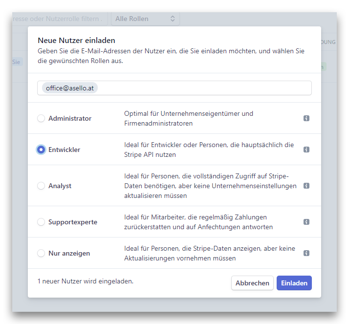 Klicken Sie rechts auf den Button „+ Neues Mitglied“. Geben Sie nun die E-Mail-Adresse office@asello.at in das Feld ein und wählen Sie als Rolle für das neue Mitglied „Entwickler“ aus.