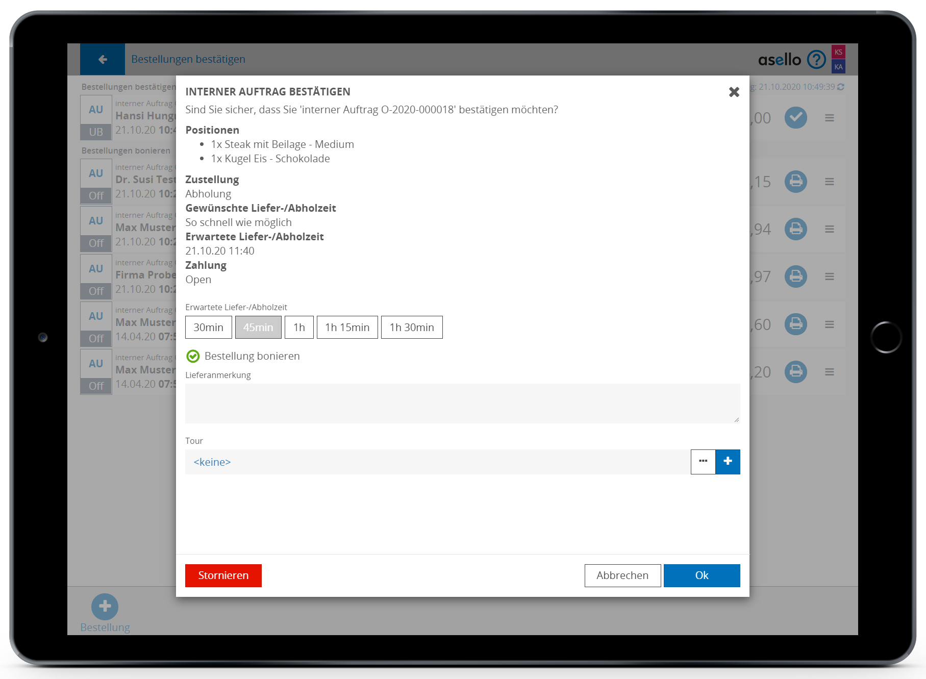 Um eine Bestellung muss das asello Zusatzmodul "Tourenplanung" aktiviert sein.