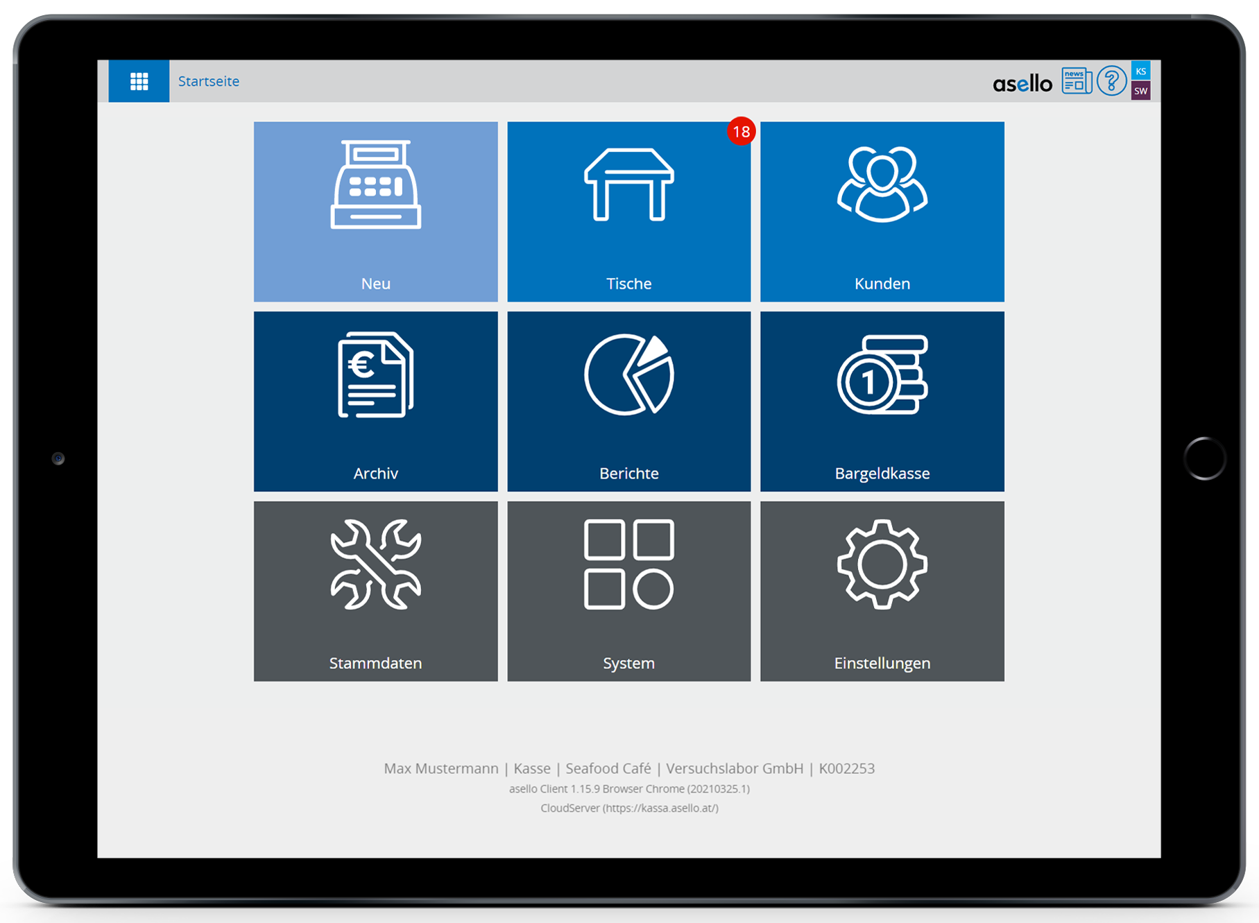 Mit dem neuen Update kommen auch neue Farben. Jedes asello Produkt wird zukünftig, für die einfachere Unterscheidung, mit einer eigenen Farbe gekennzeichnet. Daher sind alle Kacheln in aselloPOS nun umgefärbt worden und die neue Startseite erstrahlt in unterschiedlichen Blautönen.
