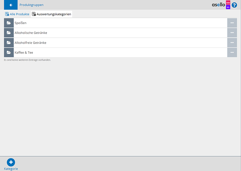 Zusätzlich zu der Produktgruppe kann bei jedem Produkt eine Auswertungskategorie ausgewählt werden. Damit kann ein unabhängiger Bericht erstellt werden. Beispiel: Speißen, Alkoholische Getränke, Tee und Kaffee.