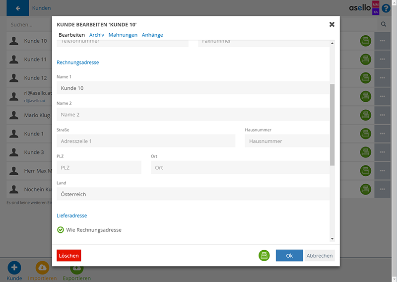 Es kann je Kunde eine Rechnungsadresse und bei Bedarf eine weitere Lieferadresse eingegeben werden. Bei der Erstellung eines Lieferscheins wird die Lieferadresse verwendet, beim Erstellen einer Rechnung die Rechnungsadresse.