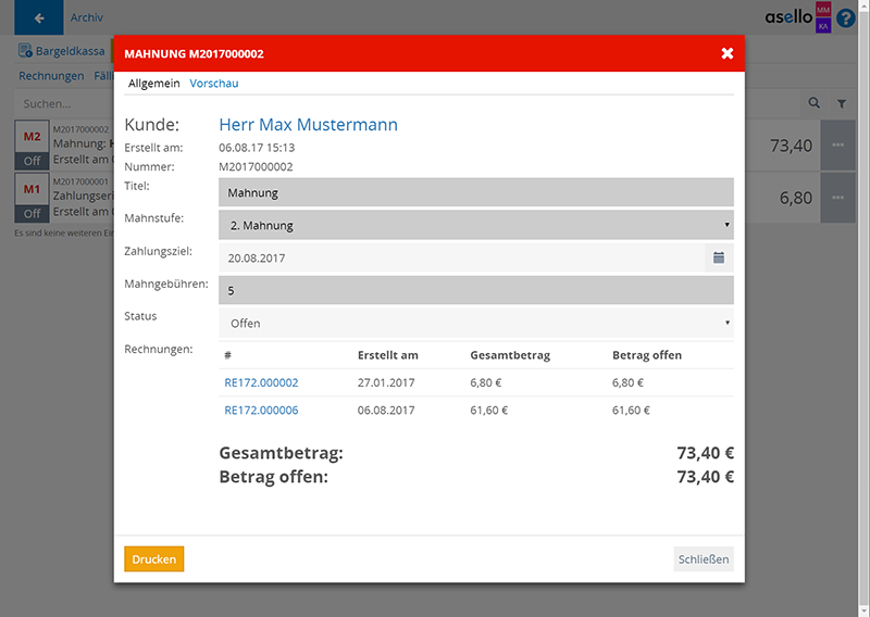 Bei Zielrechungen können Mahnungen in drei Mahnstufen erstellt werden. Die Zielrechungen und Mahnungen haben ein Fälligkeitsdatum. Im Archiv werden alle fälligen Rechnungen angezeigt. Zur Beschreibung