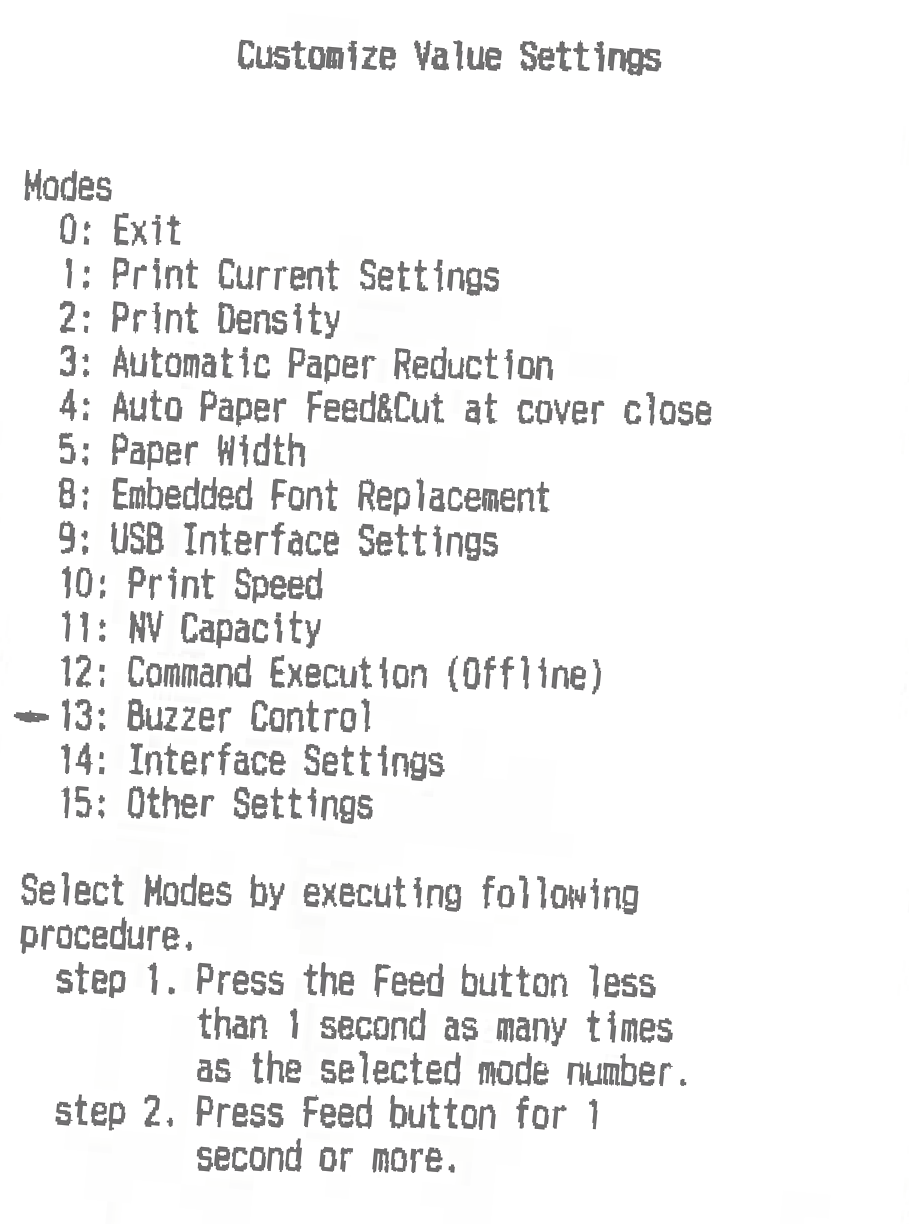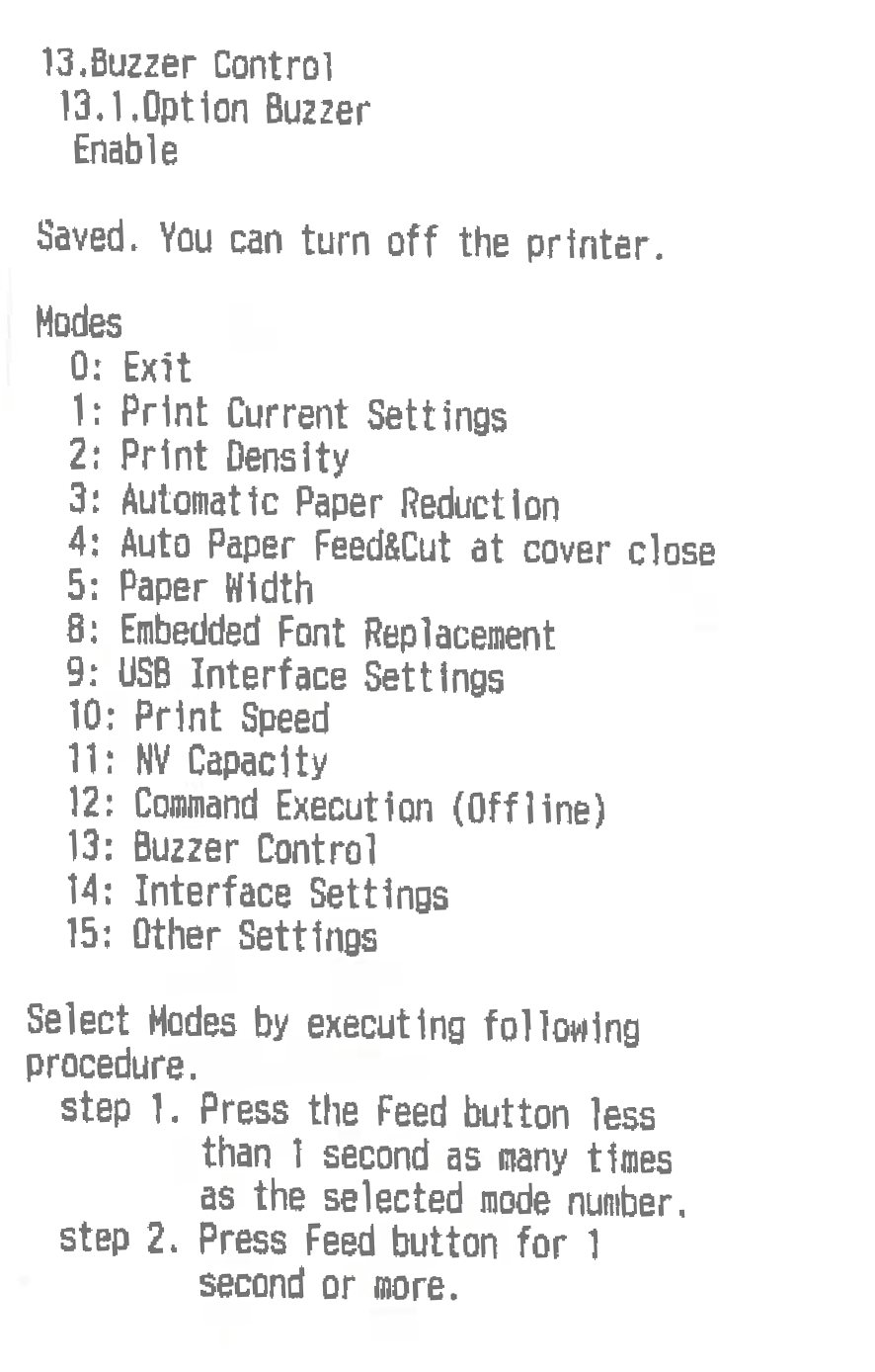Den Buzzer muss man nur am Drucker konfigurieren. Schalten Sie dazu den Drucker aus, drücken Sie den Feedbutton und schalten Sie ihn danach ein. Damit starten Sie den Konfigurations- und Diagnosemodus des Druckers. Der Drucker druckt danach eine Diagnoseseite aus. Lassen Sie nun den Feed-Button los.