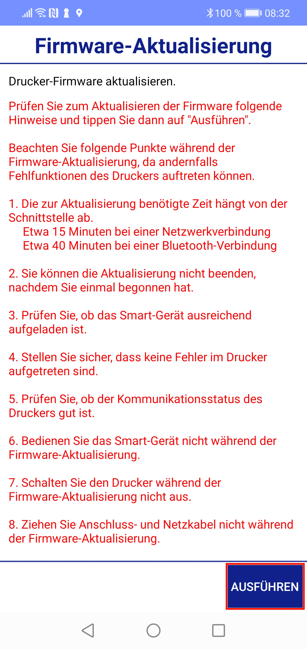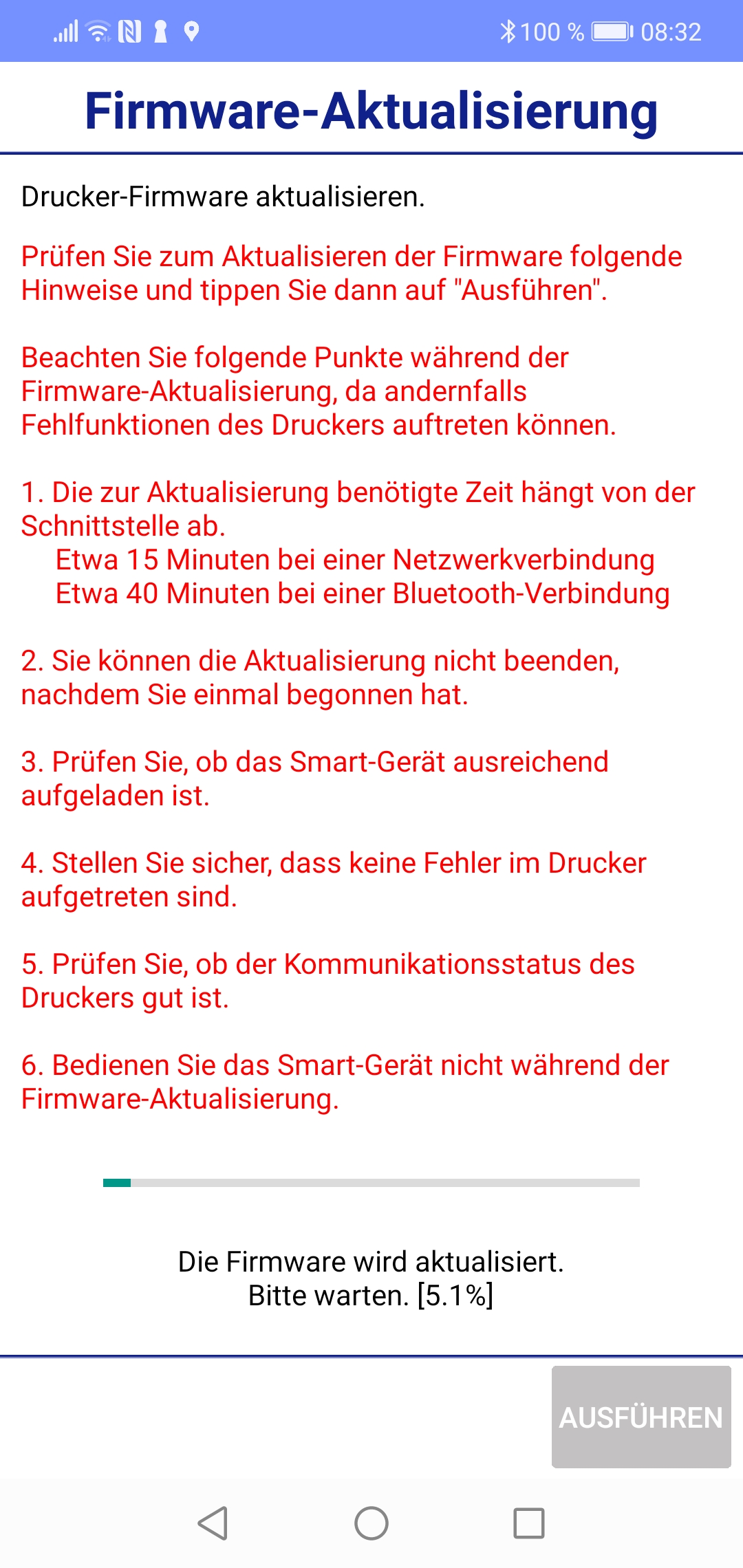 Führen Sie danach die Verbindung zum Drucker und die Installation der neuen Firmware durch.