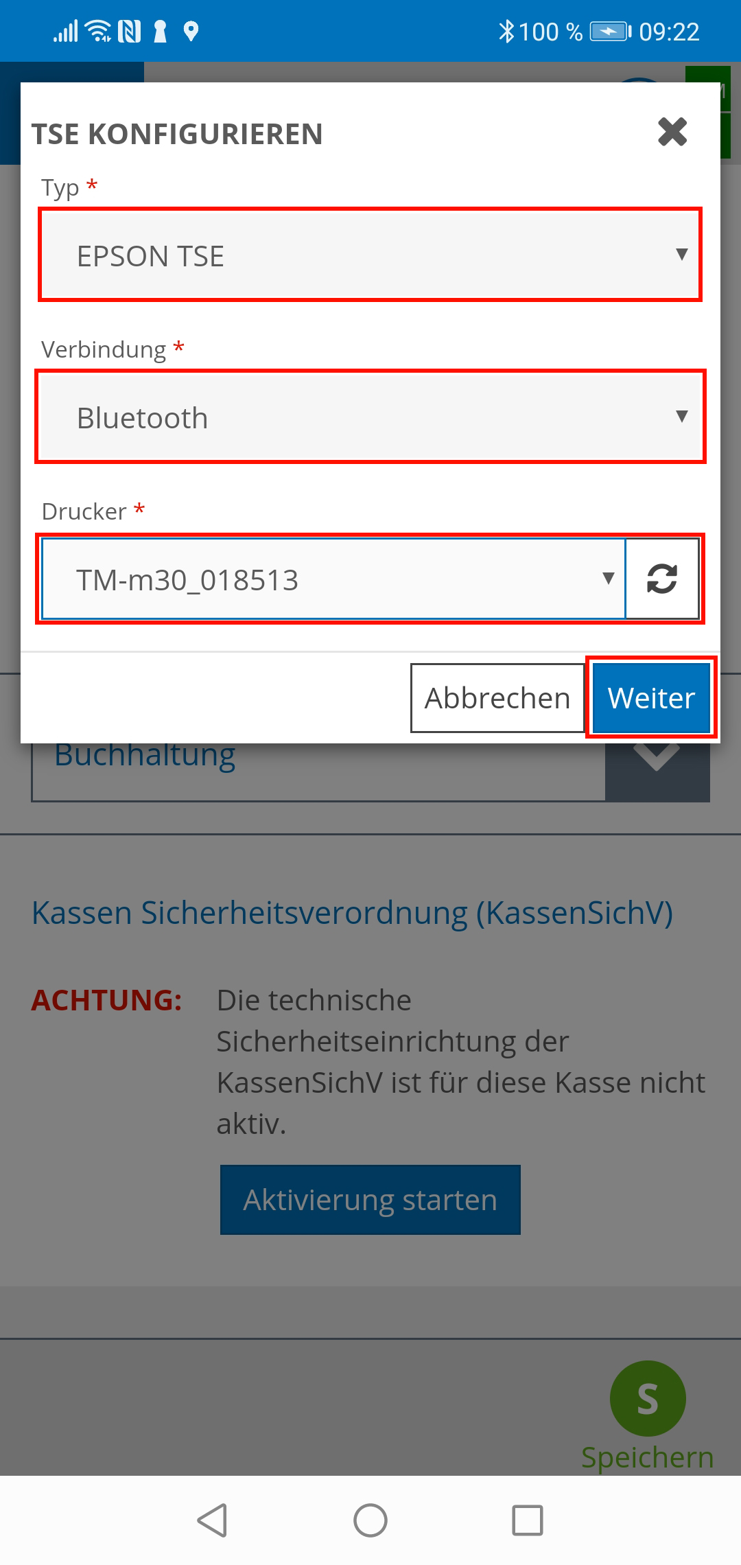 Die TSE in einem Epson TM-m30 Drucker, die über Bluetooth verbunden ist, kann mit einem Gerät verwendet werden (iOS / Android Betriebssystem). Um die TSE zu konfigurieren ist auf diesem Gerät die Inbetriebnahme der TSE notwendig. Folgende Schritte sind auszuführen: