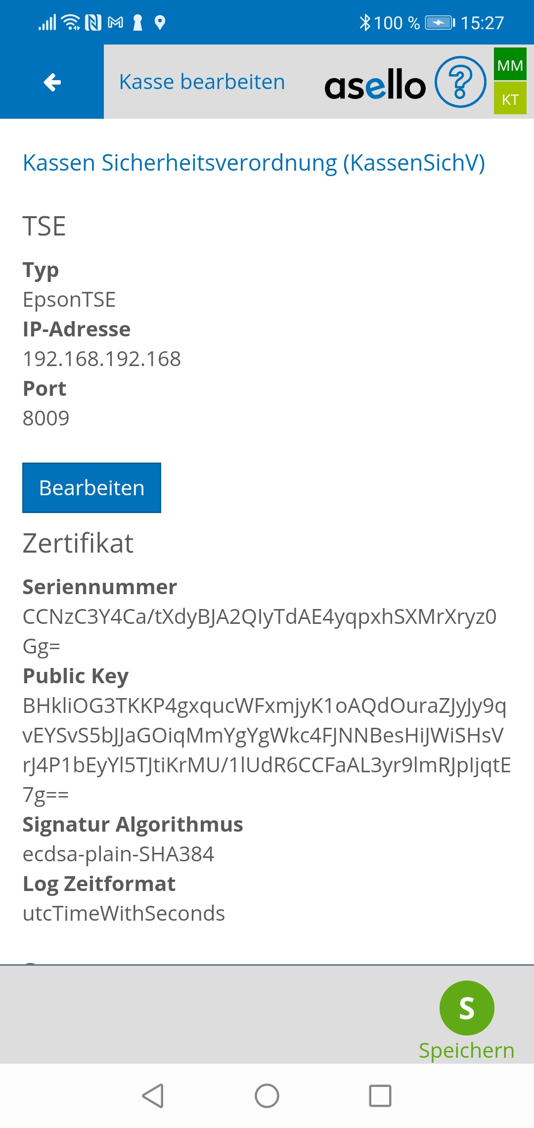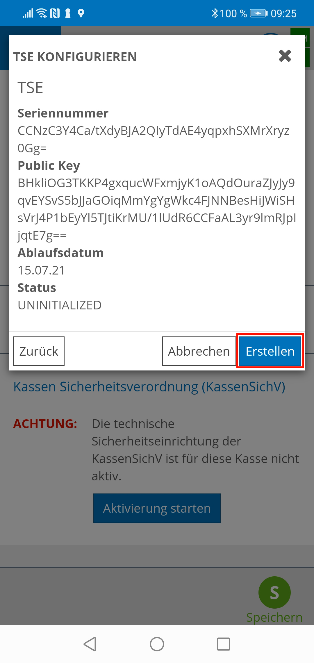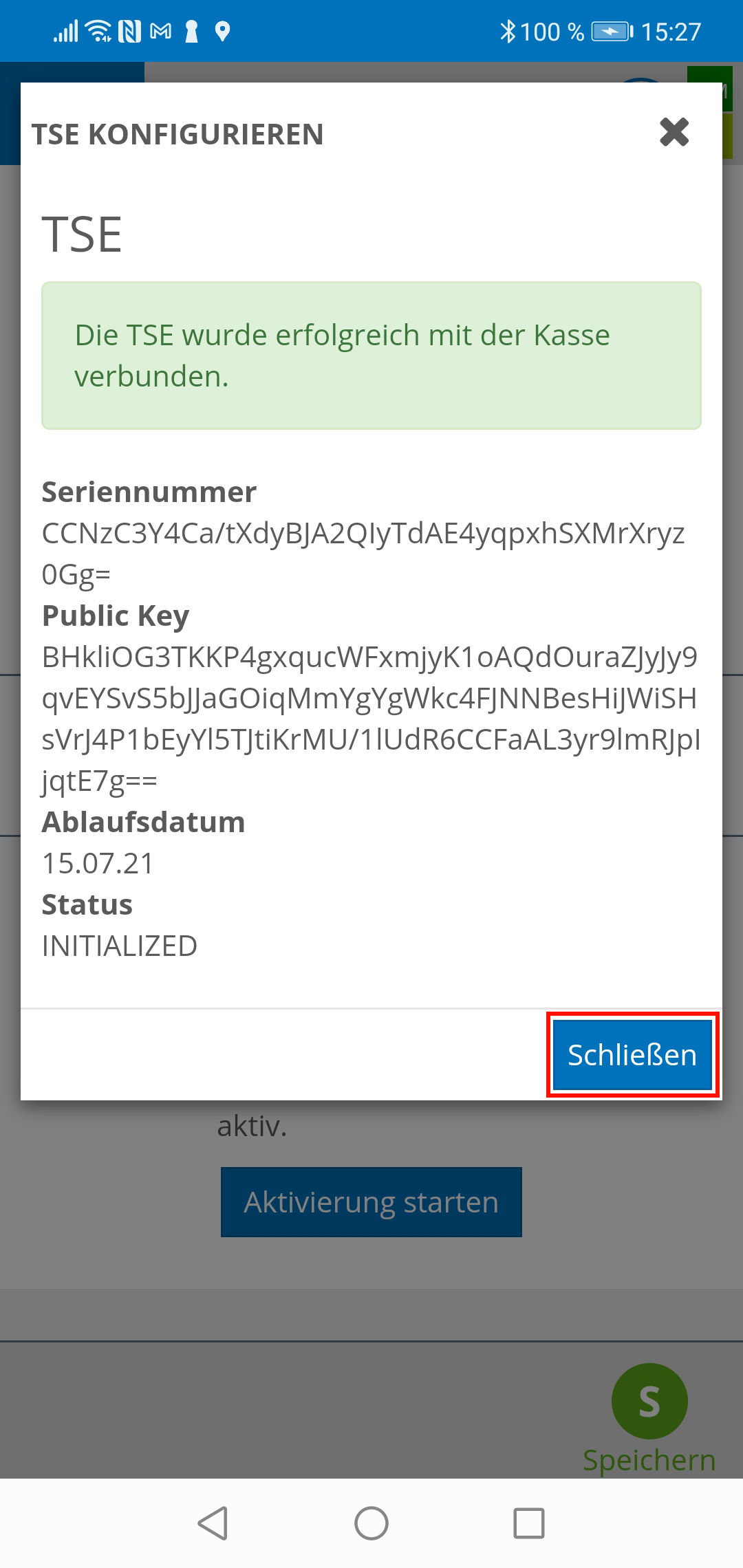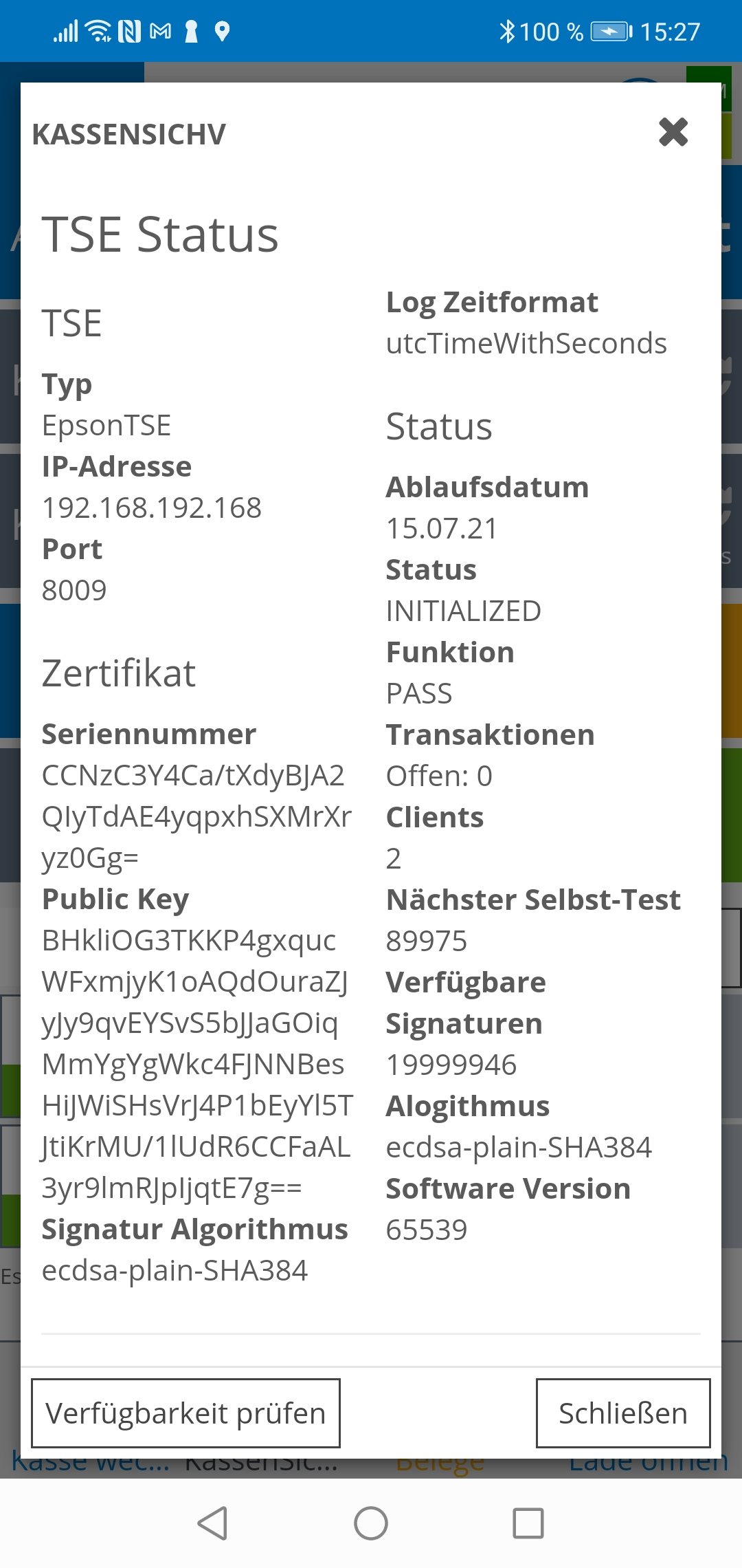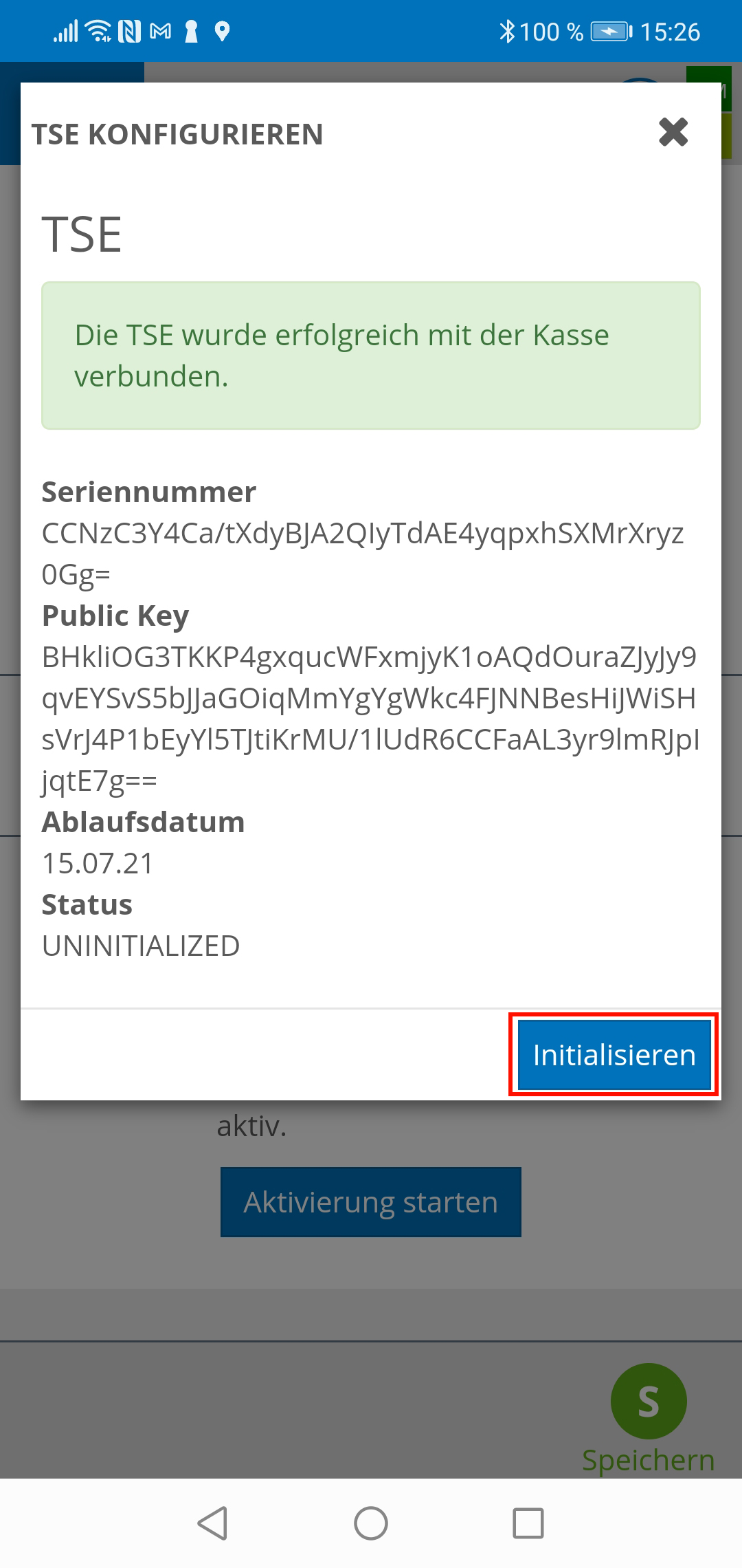 Wenn eine Verbindung zur TSE möglich ist, werden danach die Seriennummer, das Ablaufdatum und der Public-Key angezeigt. Sowie der Status, in dem sich die TSE befindet.
