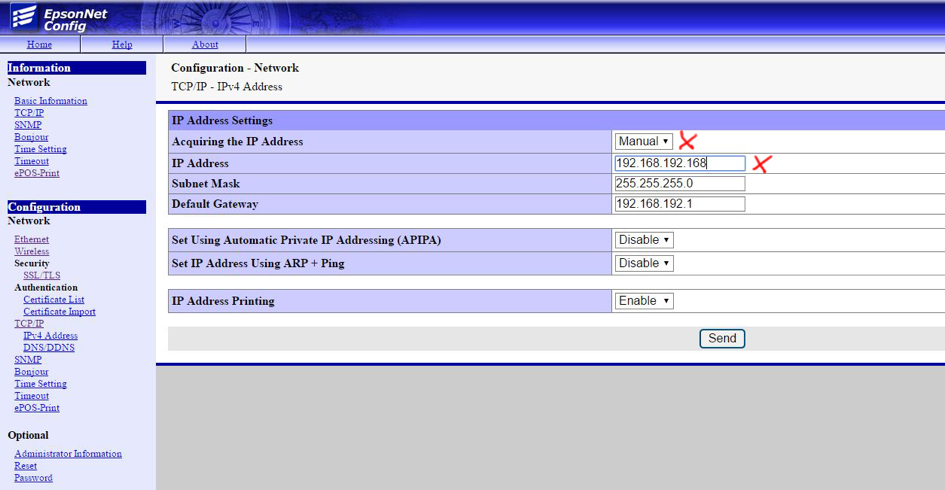 Gehen Sie nun auf „Configuration“ > „TCP/IP“ und stellen sie den Modus auf Manuell und die gewünschte IP-Adresse ein. Beispiel 192.168.192.168. Danach klicken Sie auf „Senden“ und auf der folgenden Seite auf „Reset“. Danach wird der Drucker neu gestartet und übernimmt die konfigurierte IP-Adresse. Ab jetzt wird kein kleiner Beleg mit der IP-Adresse ausgedruckt.