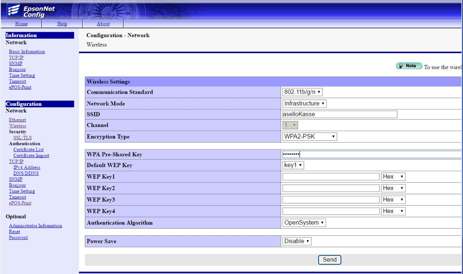 Gehen Sie auf den Menüpunkt „Configuration“ > „Wireless“ und geben Sie hier die SSID des WLANs an (z.B. asello) und das WLAN Passwort unter „WPA Pre-Shared Key“. Speichern Sie danach die Konfiguration mit „Send“ und führen Sie danach einen Reset des Druckers auf der folgenden Seite durch. Danach startet der Drucker neu und Verbindet sich automatisch mit dem WLAN. ACHTUNG: Stellen Sie dabei sicher, das der Drucker nicht per LAN verbunden ist, da nur eine Schnittstelle zur selben Zeit funktioniert. ACHTUNG: Das Verbinden mit dem WLAN kann 1 – 5 Minuten in Anspruch nehmen.