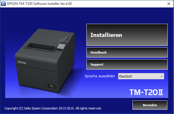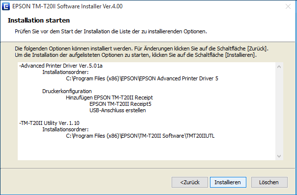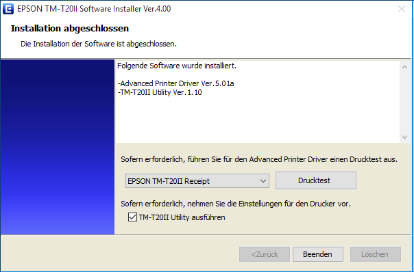 Nach Abschluss der Installation können Sie eine Testseite drucken (Drucktest). Als Option können Sie mit dem EPSON Utility-Programm weitere Einstellungen vornehmen. Wenn sie das nicht möchten, deaktivieren Sie die Option unten (TM-T20II Utility ausführen). asello Bondrucker USB