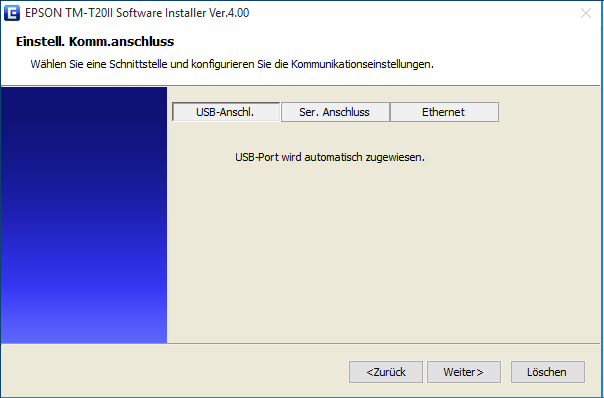 Im nächsten Fenster wird der Anschlusstyp gewählt. Bitte wählen Sie USB-Anschl. (Standardauswahl).