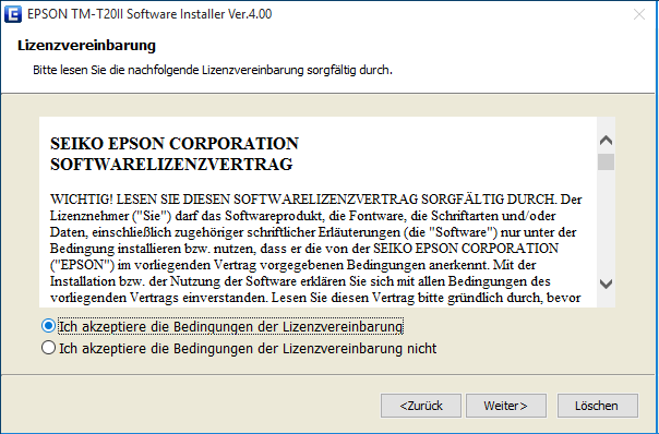 Akzeptieren Sie den EPSON Softwarelizenzvertrag und klicken Sie auf Weiter.