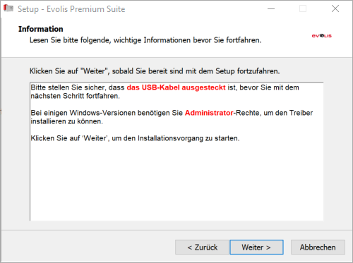 Bitte stellen Sie sicher, dass das USB-Kabel ausgesteckt ist, bevor Sie mit dem nächsten Schritt fortfahren. Danach klicken Sie auf weiter.