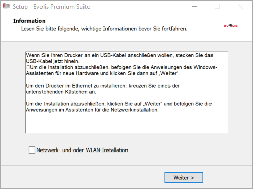 Überprüfen Sie Ihre Angaben und klicken dann auf Installieren. Warten Sie bis die Installation abgeschlossen ist. Danach schließen Sie das USB Kabels des Druckers an, scahlten den Drucker ein und klicken auf Weiter.