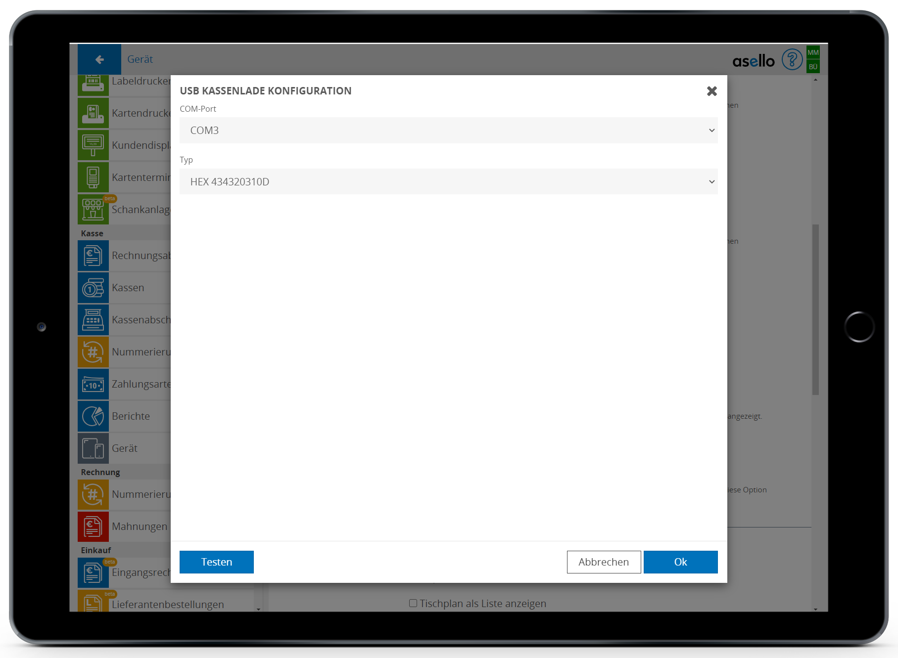 Nach der Aktivierung kann die Kassenlade konfiguriert und gestetet werden. Wählen Sie dazu den COM-Port und den Typ für die Ansteuerung.