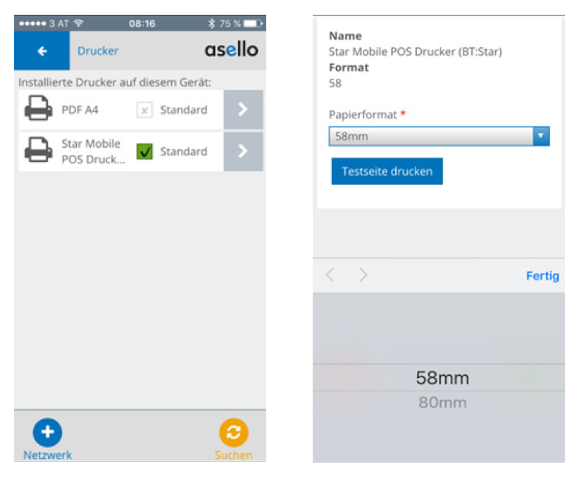 Öffnen Sie nun asello und den Menüpunkt System/Drucker. Setzen Sie den Star Mobile POS Drucker auf Standard und klicken Sie anschließend auf den grauen Pfeil um in das Untermenü des Druckers zu kommen. In diesem Menü setzen Sie das Papierformat auf 80mm.