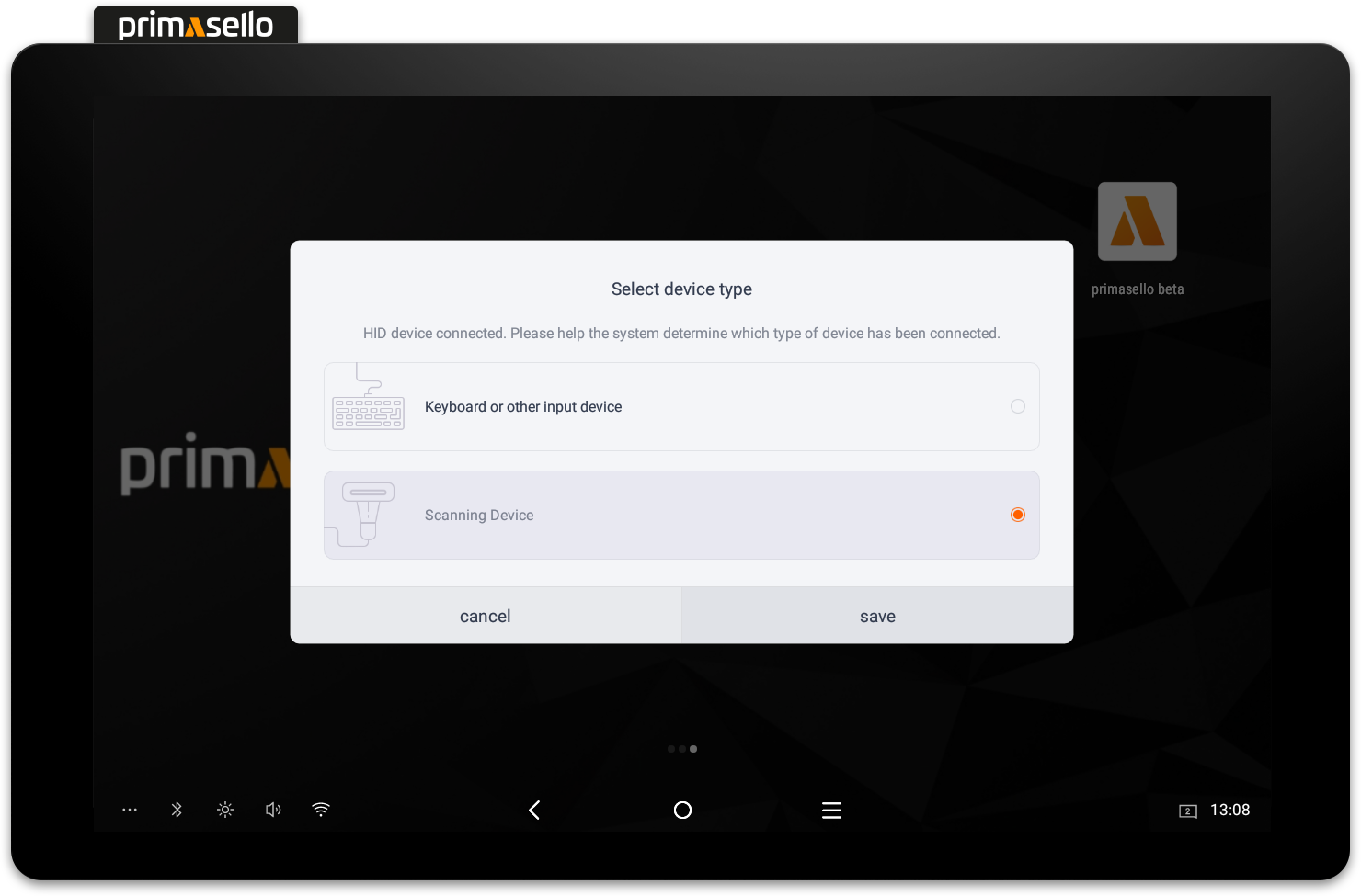 Der Scanner wird über ein USB-Kabel mit der primasello Registrierkasse verbunden. Um den Scanner anzuschließen, stecken Sie den USB-Stecker in den USB-Anschluss auf der Unterseite Ihres primasello Kassengeräts. Der Scanner wird über die Kasse mit Strom versorgt und ist somit betriebsbereit, sobald die Registrierkasse eingeschalten ist.