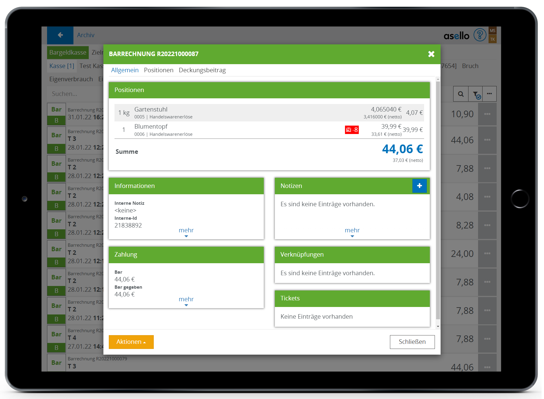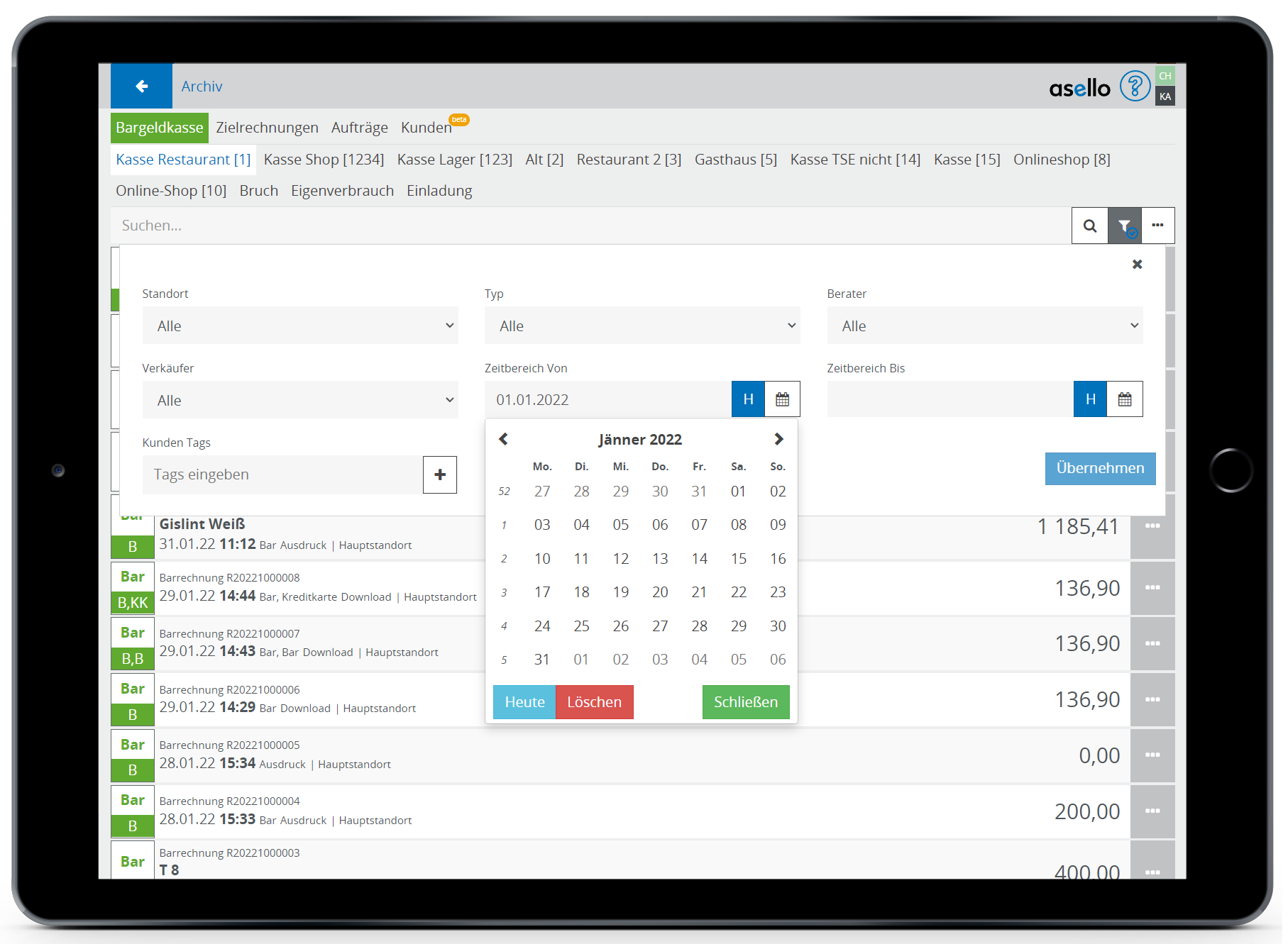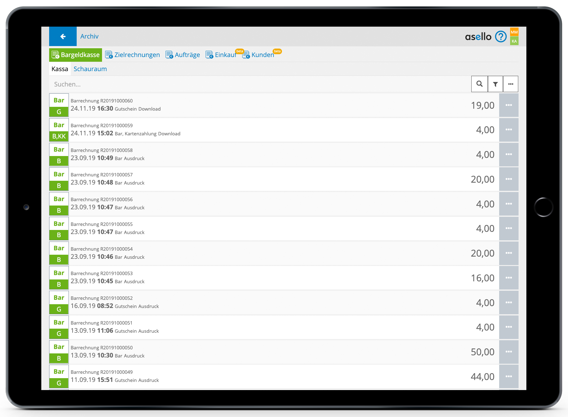 Im Archiv sehen Sie alle Barrechnungen, Zielrechnungen und Auftragsdokumente chronologisch aufgelistet. Um in das Archiv zu gelangen, klicken Sie auf der asello Startseite auf die blaue Kachel „Archiv".