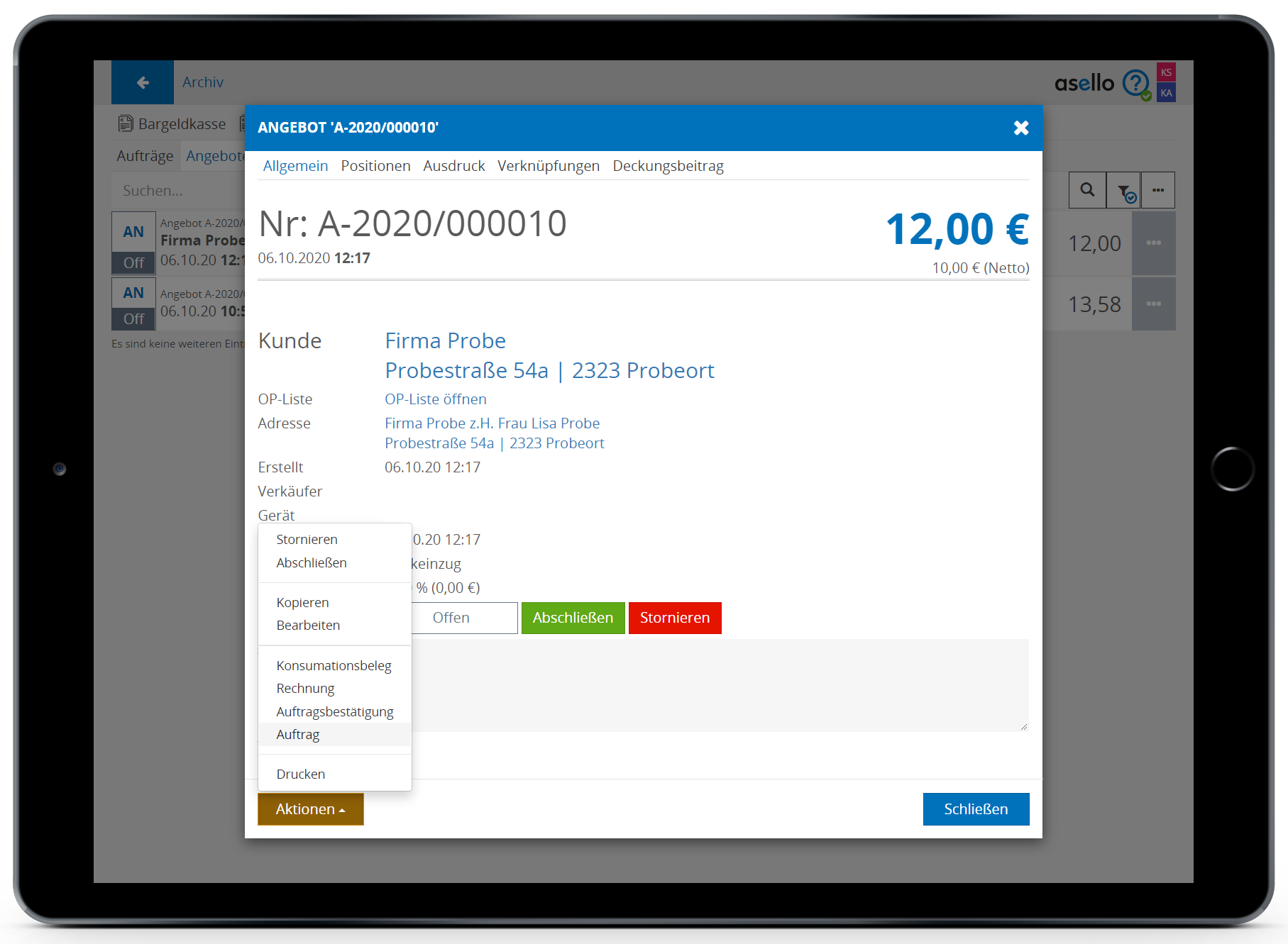 Haben Sie bereits Angebote in asello erstellt, können Sie aus diesen einen Auftrag erstellen. Wie dies funktioniert erfahren Sie im Leitfaden Zusatzmodul Rechnung / Vom Angebot bis zur Rechnung.