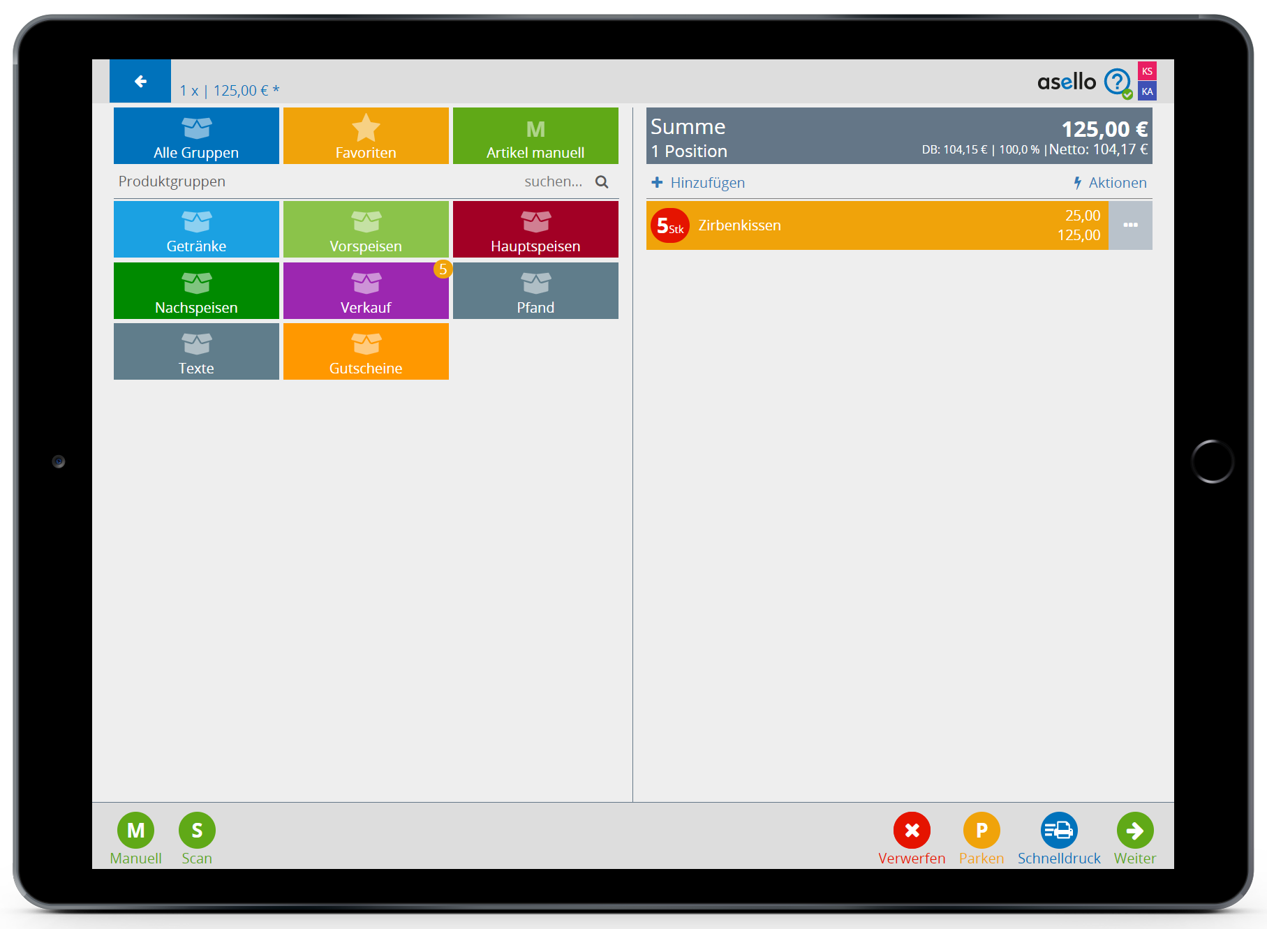 Klicken Sie auf der Startseite auf die grüne Kachel „Neu“ im linken oberen Eck, um ein neues Dokument zu erstellen. Fügen Sie die Produkte hinzu, die Sie in dem Auftrag benötigen. Haben Sie alle Positionen hinzugefügt klicken Sie rechts unten auf das grüne Pfeil-Symbol „Weiter“.
