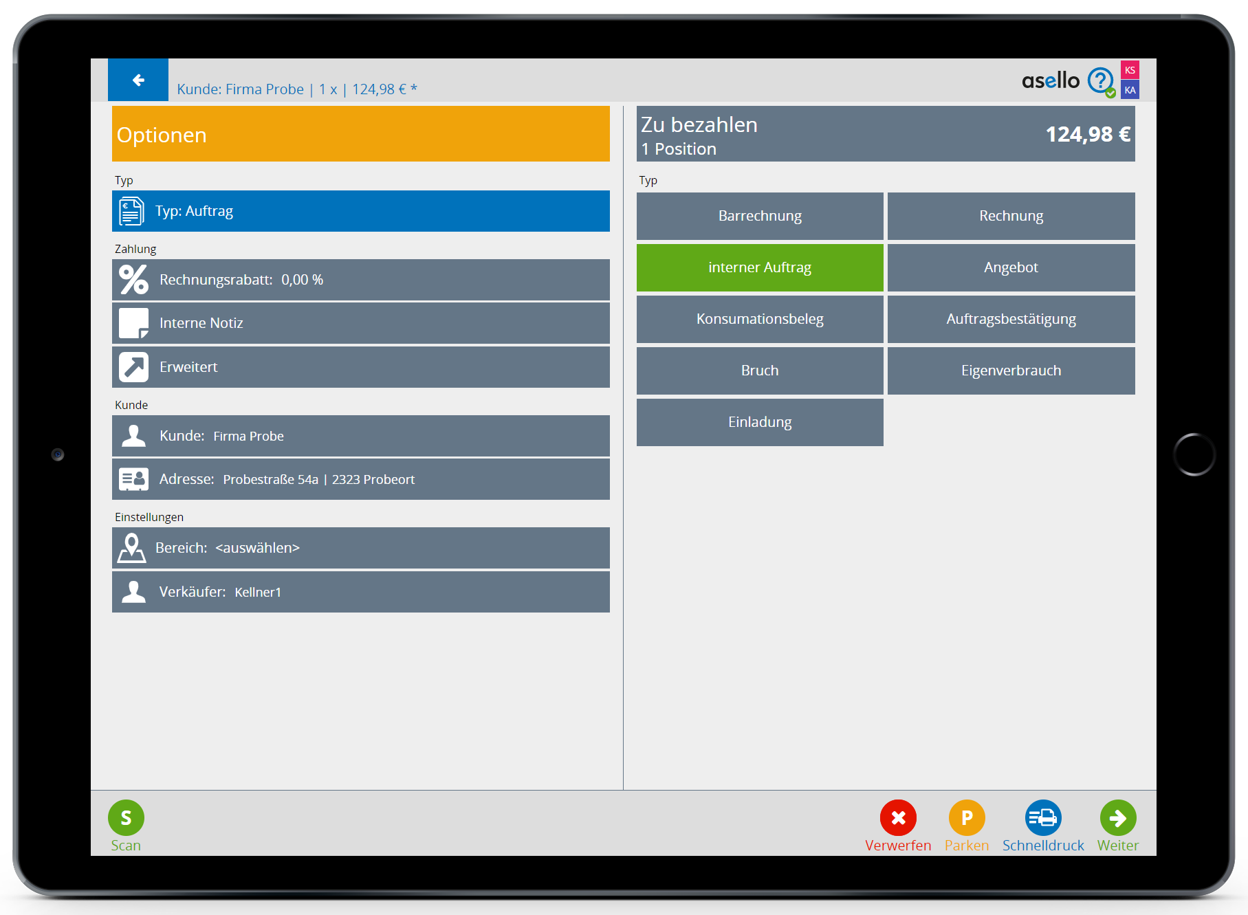 Wählen Sie auf der rechten Seite den Dokumententyp aus. Um einen neuen Auftrag zu erstellen klicken Sie auf die Schaltfläche „interner Auftrag“. Auf der linken Seite können Sie zusätzliche Einstellungen treffen, wie z.B. einen Kunden dem Auftrag hinzufügen oder einen Rabatt gewähren.