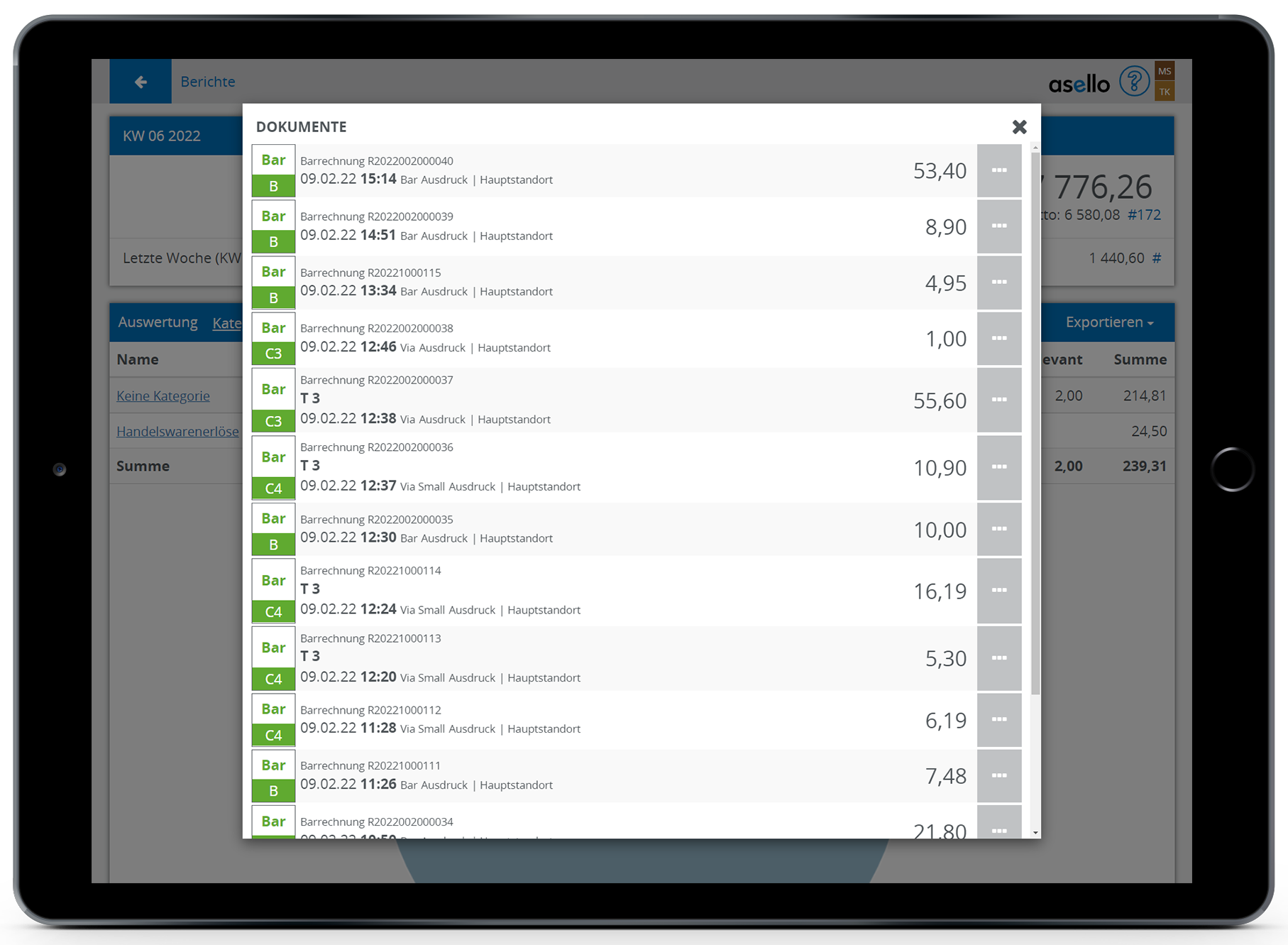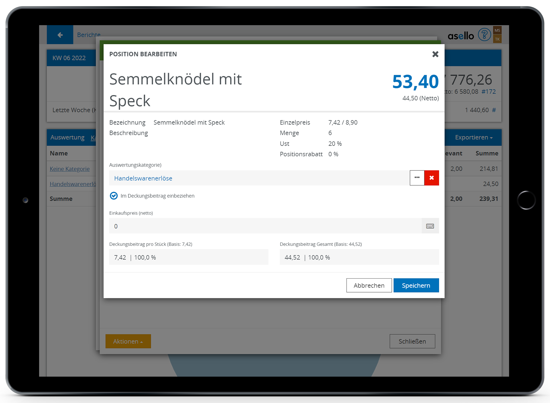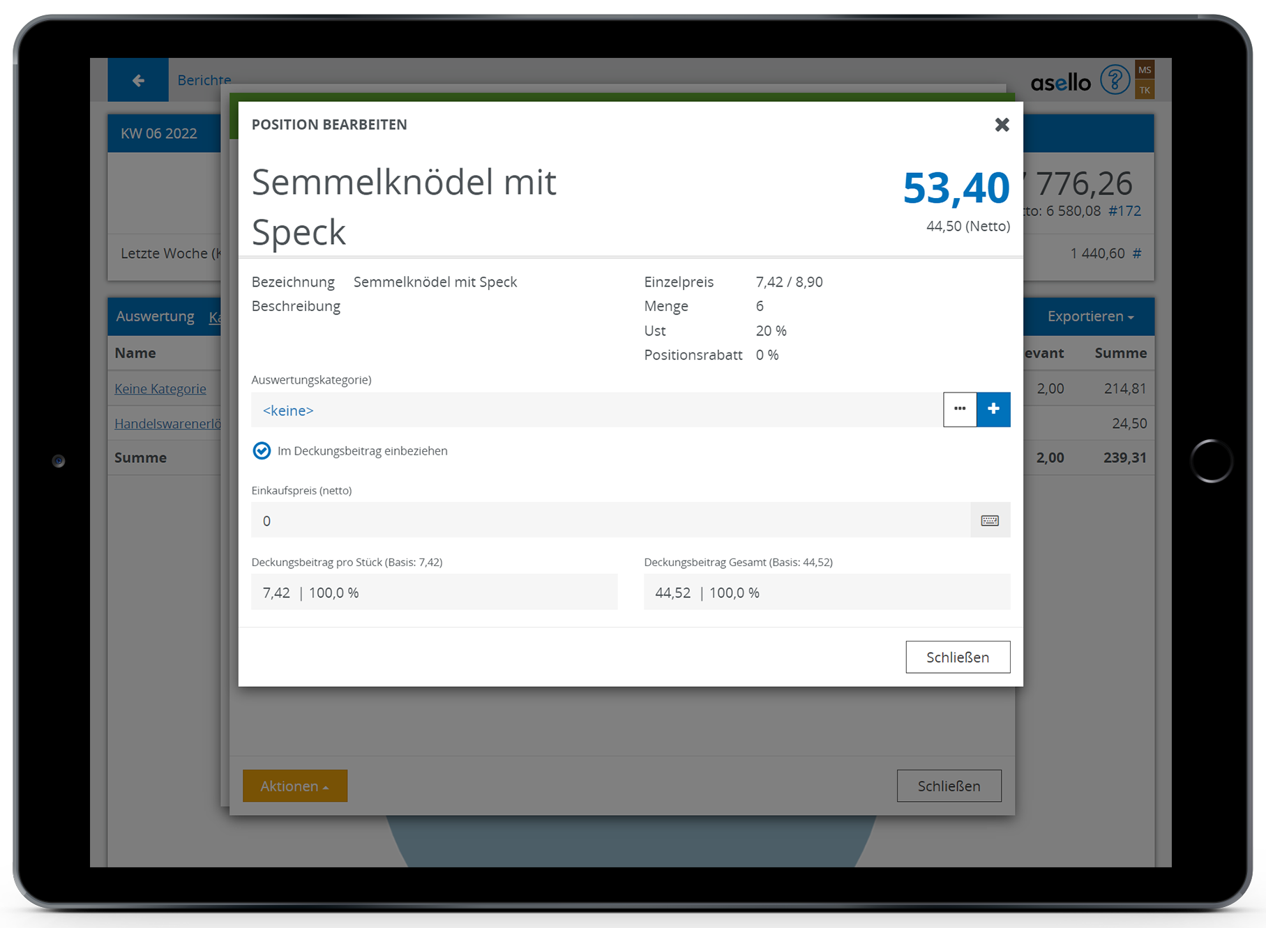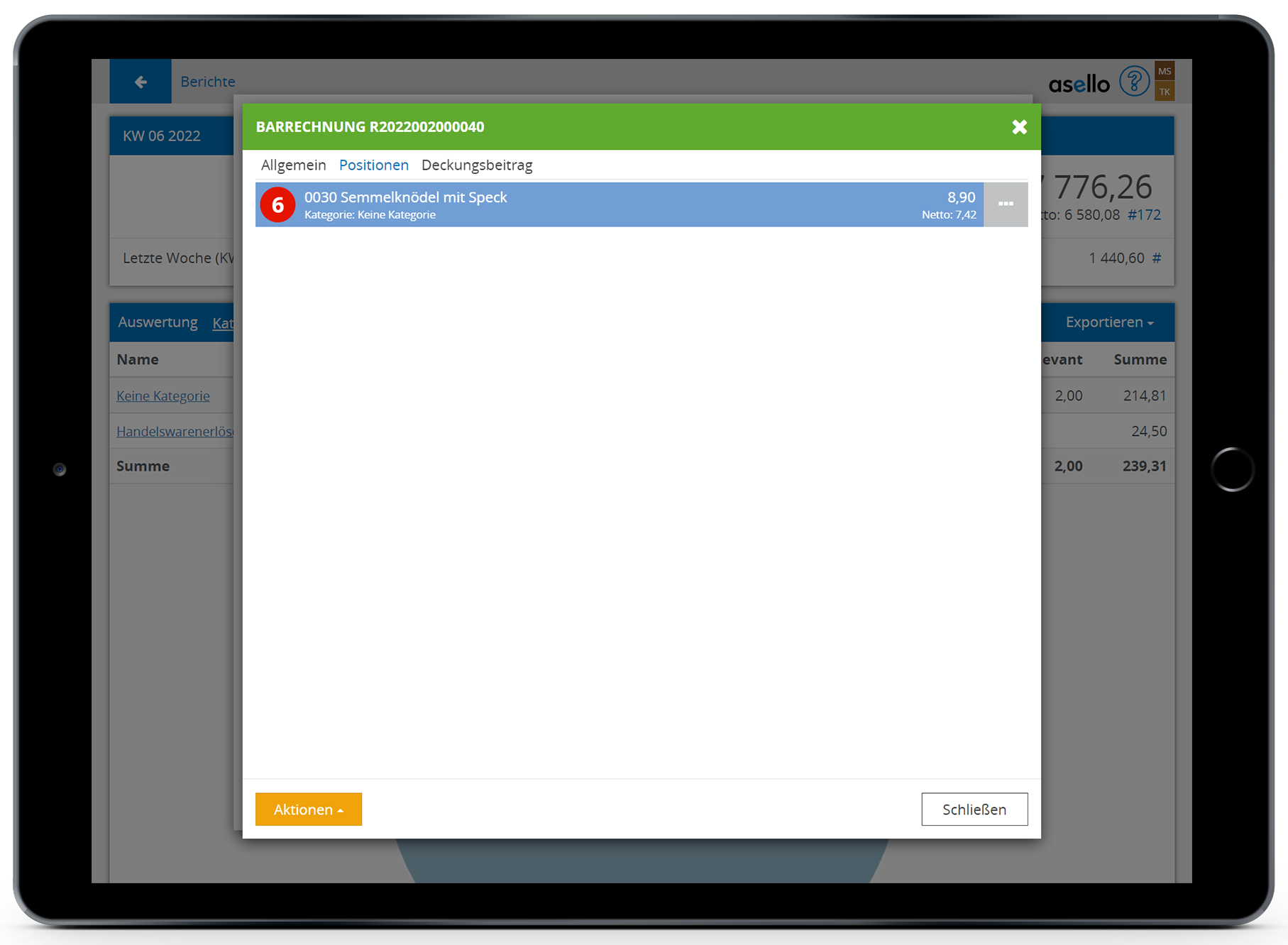 Hier sind nun alle Positionen dieses Beleges aufgelistet. Klicken Sie nun auf die drei Punkte neben der Position, bei der Sie Änderungen vornehmen wollen. Es öffnet sich wieder ein neues Fenster, in dem Sie nun die Auswertungskategorie hinzufügen können.