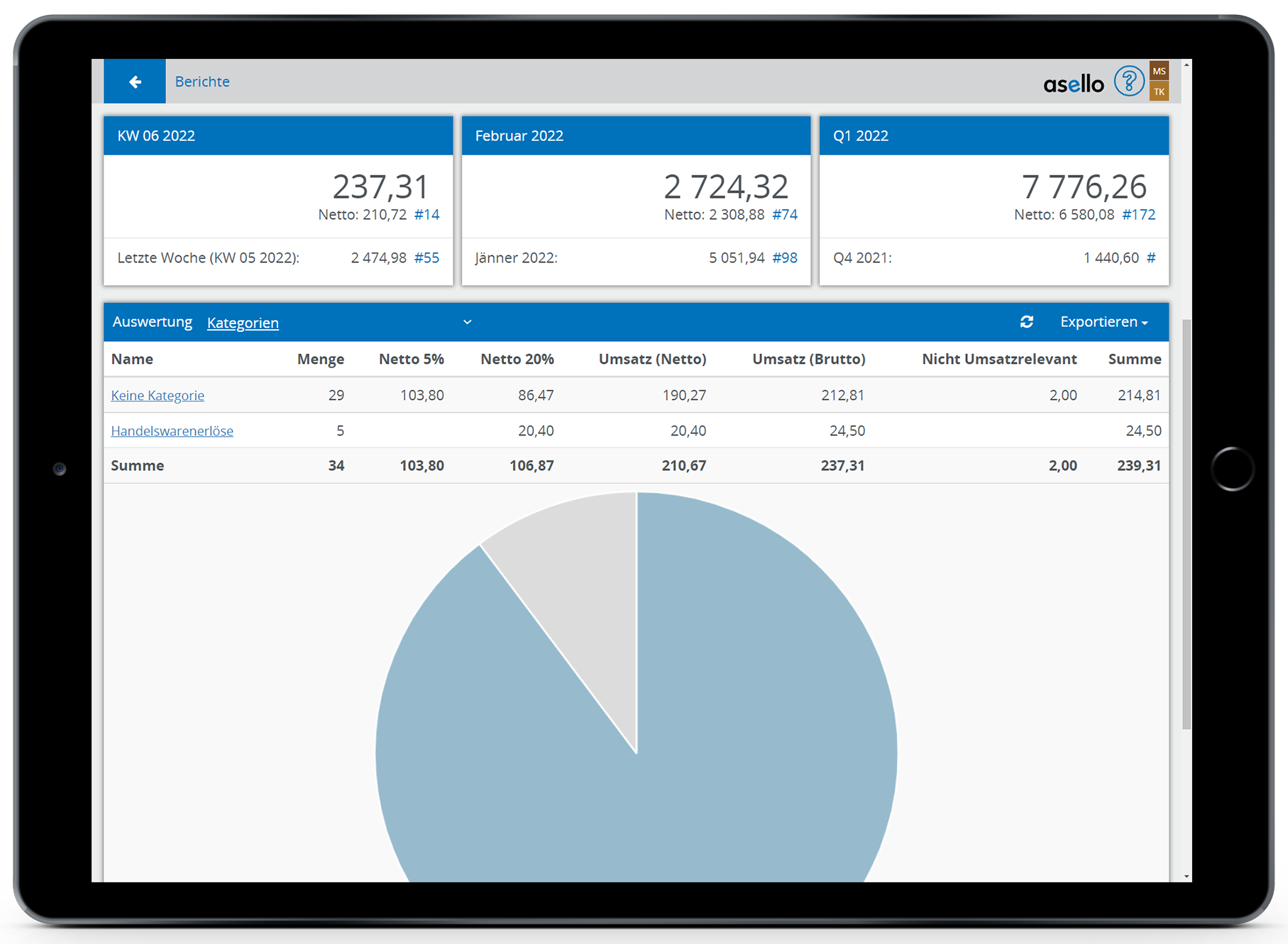 Wenn Sie nun weiter nach unten scrollen, sehen Sie eine Zusammenfassung Ihrer Umsätze nach Auswertungskategorien. Alle Belege, die eine Position ohne zugeordneter Kategorie haben, sind unter dem Punkt "Keine Kategorie" zu finden.