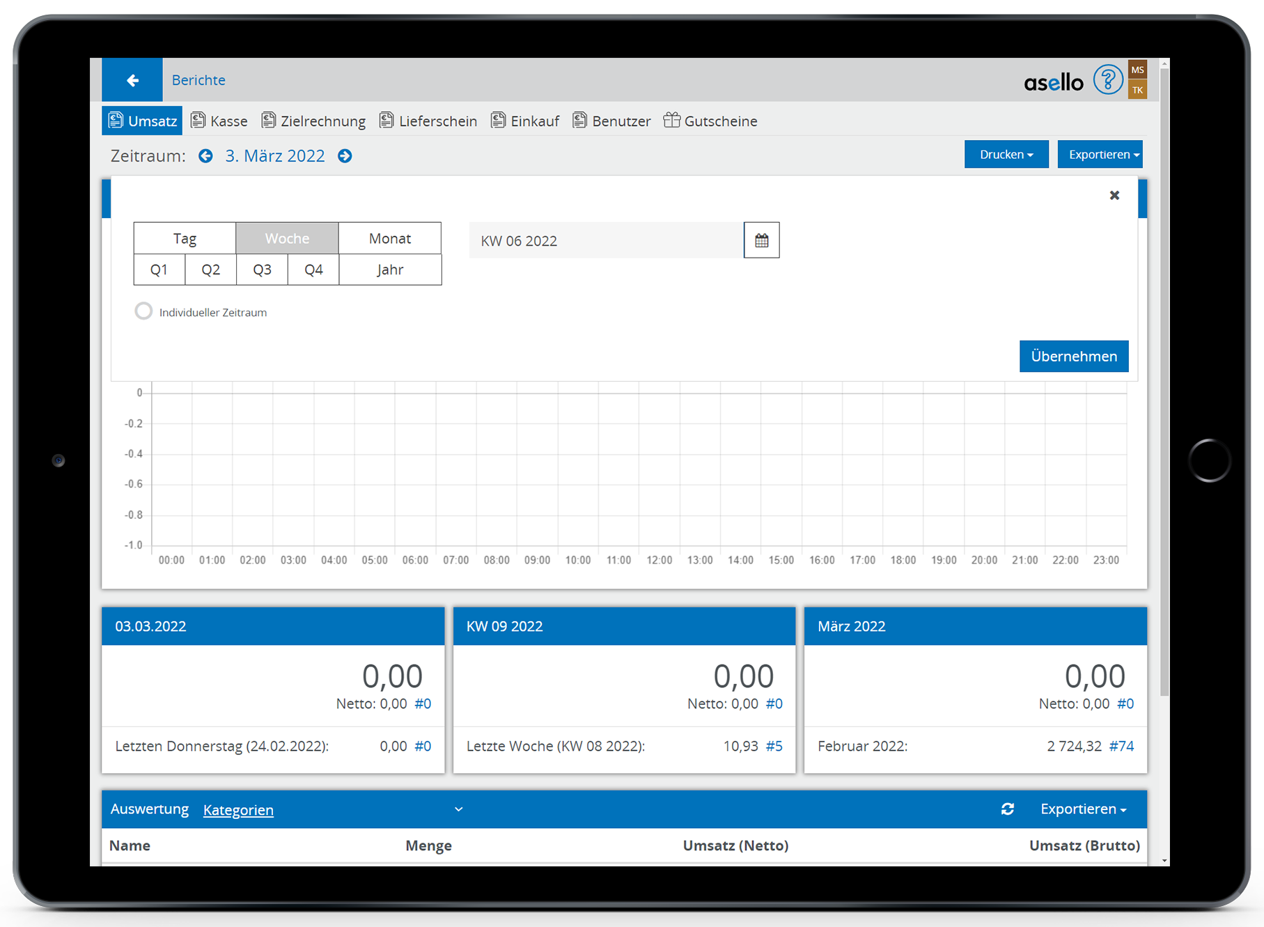 Hier sehen Sie nun eine Übersicht über die Vorgänge in Ihrer Kasse. Klicken Sie nun oben neben "Zeitraum" auf das Datum, um den Zeitraum auszuwählen, für den die Belege angezeigt werden sollen. Klicken Sie anschließend rechts unten im Popup auf "Übernehmen", um den Zeitraum zu bestätigen.