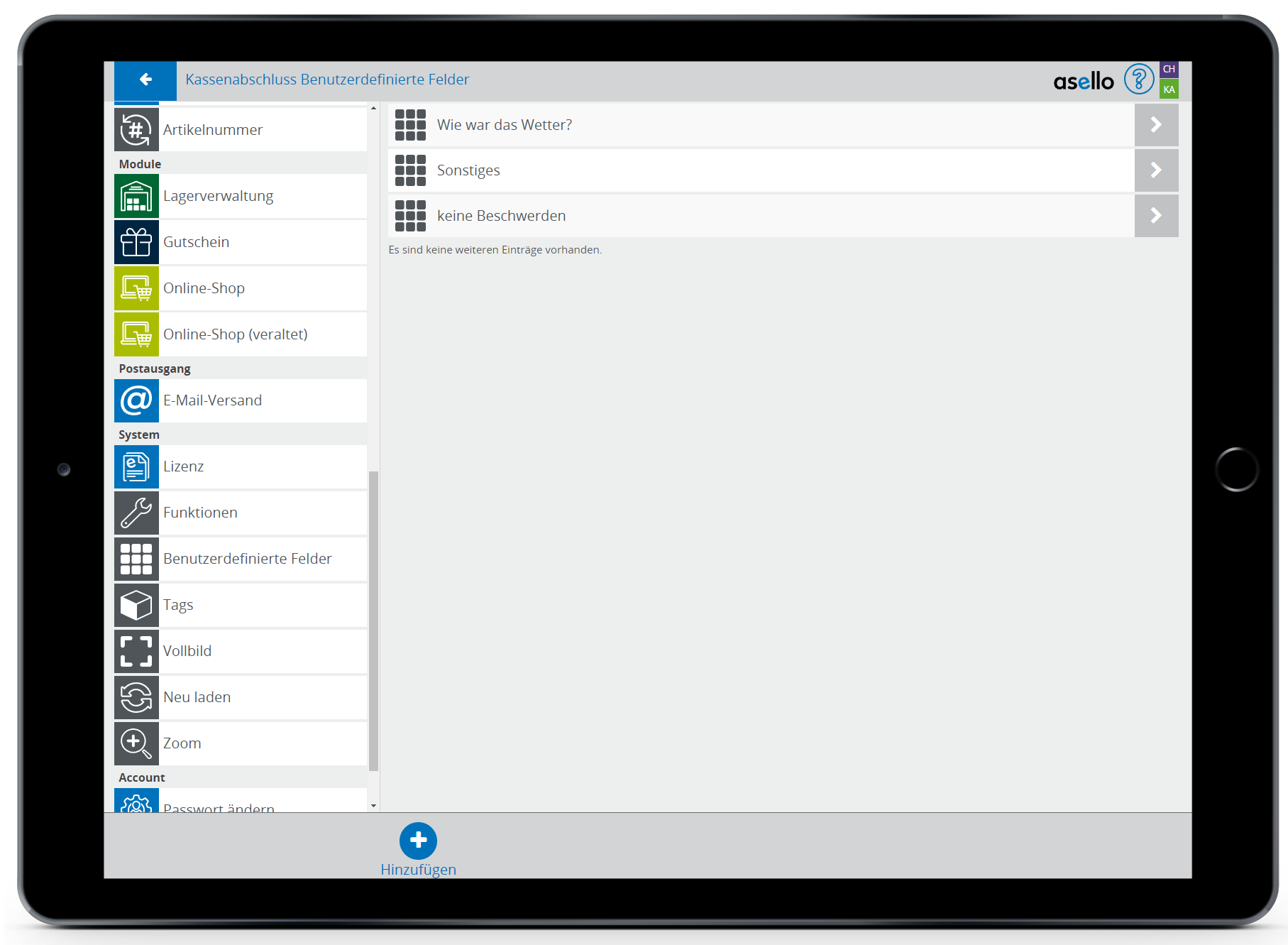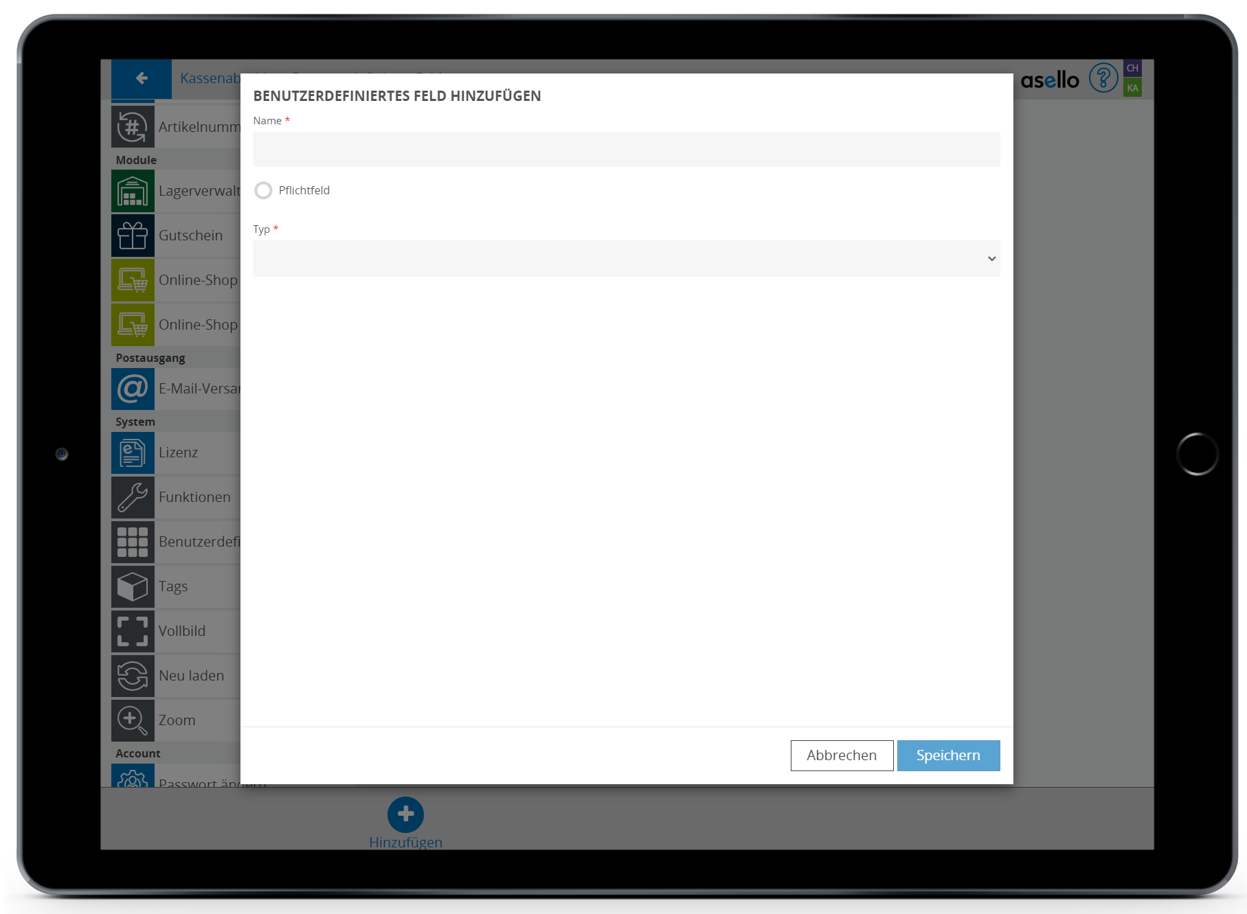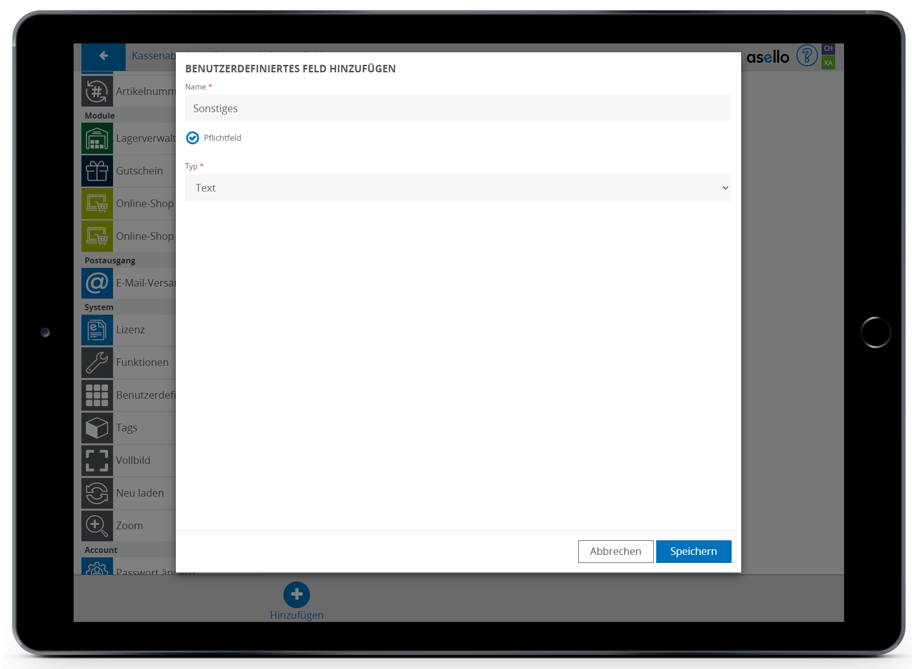 In diesem Leitfaden erfahren Sie, wie Sie in asello ein benutzerdefiniertes Feld erstellen. Benutzerdefinierte Felder können Sie für gewisse Bereiche, wie den Kassenabschluss erstellen. Mit benutzerdefinierten Feldern kann asello optimal an Ihre Anforderungen angepasst werden.