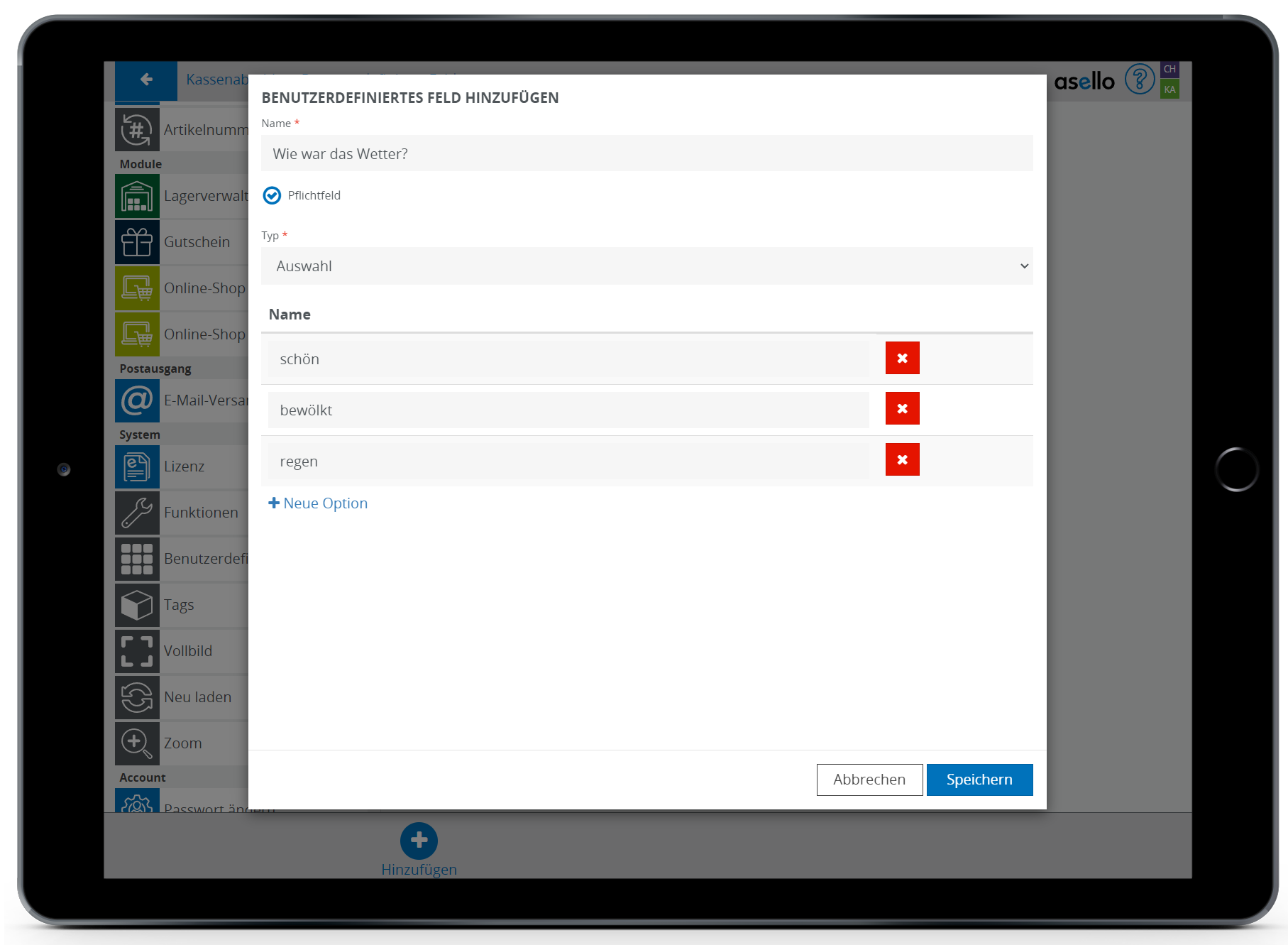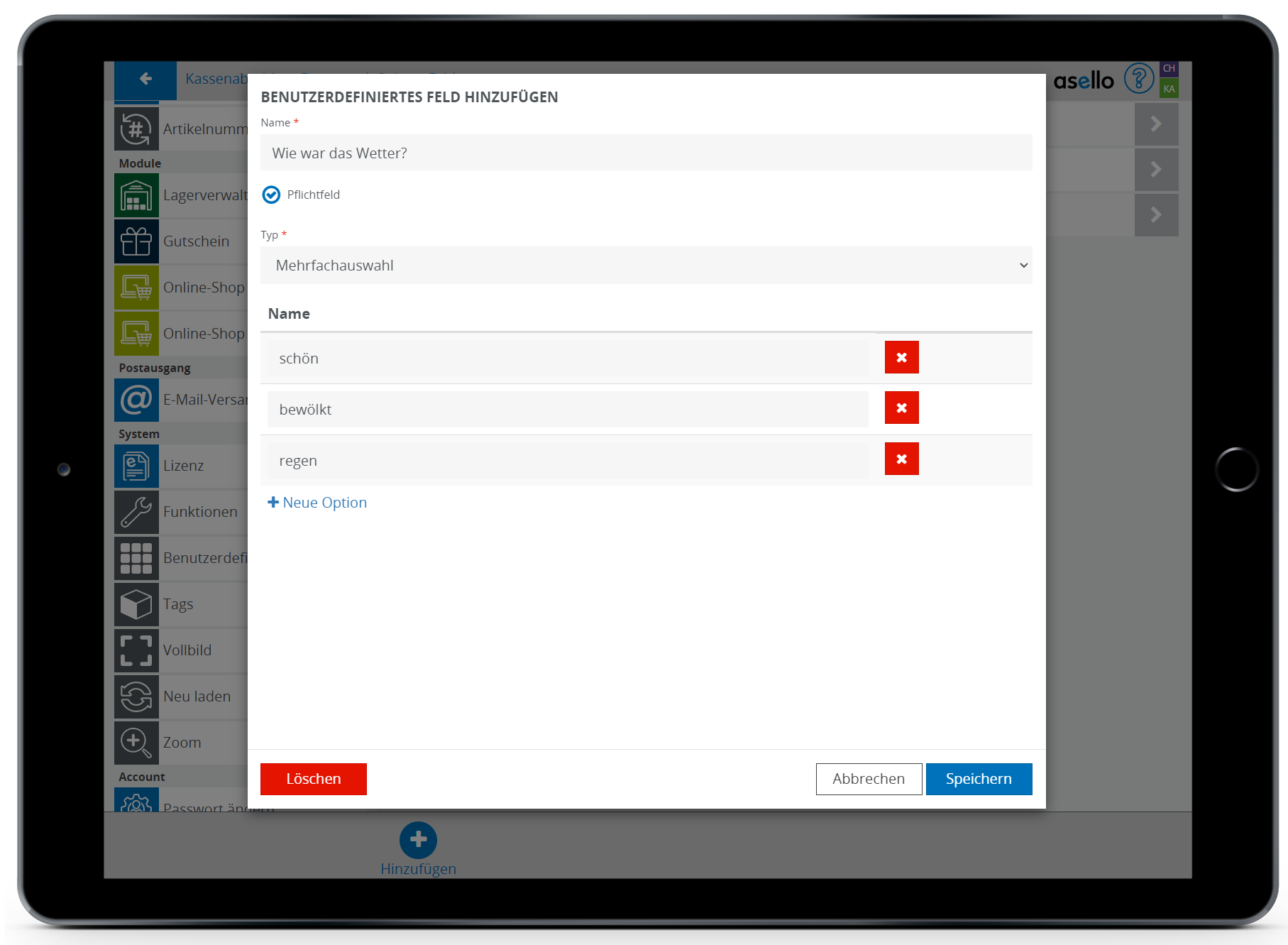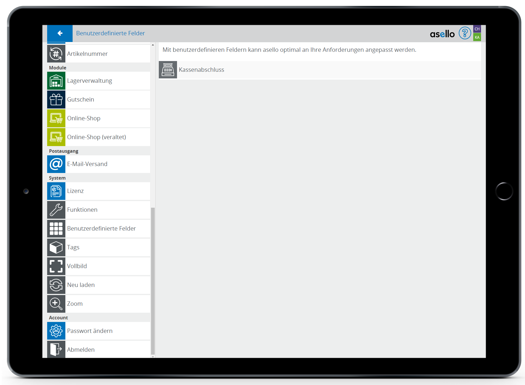 In diesem Leitfaden erfahren Sie, wie Sie in asello ein benutzerdefiniertes Feld erstellen. Benutzerdefinierte Felder können Sie für gewisse Bereiche, wie den Kassenabschluss erstellen. Mit benutzerdefinierten Feldern kann asello optimal an Ihre Anforderungen angepasst werden.