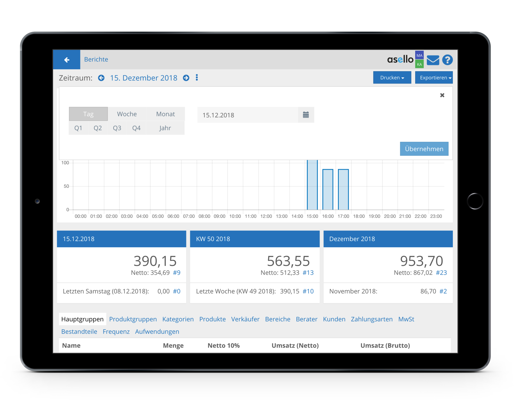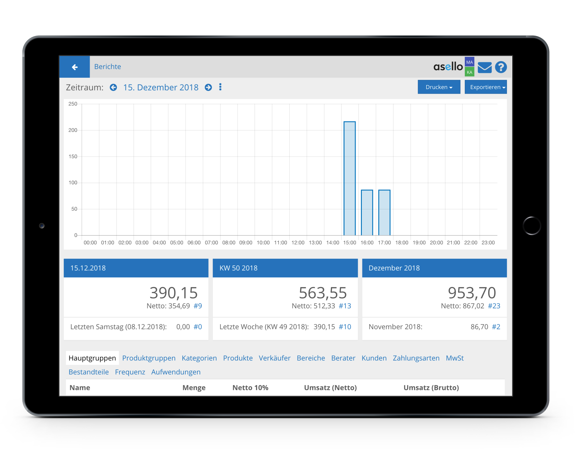 Produktgruppen | Zeigt den Umsatz Steuern, Umsatz Netto und Brutto je Produktgruppe. |