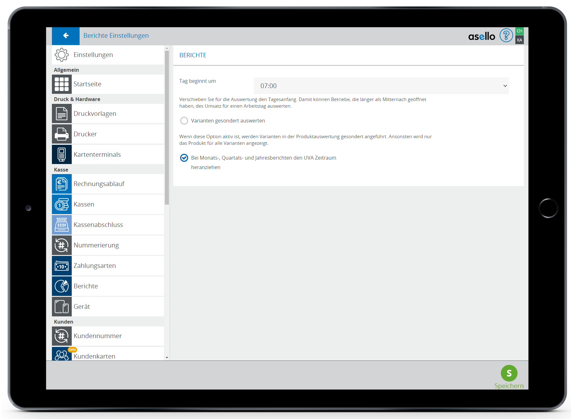 Unter Einstellungen können Sie festlegen, ab welcher Uhrzeit der Tag für die Auswertung beginnt. Sie können auch angeben ob Varianten als ein Produkt oder je Variante ausgewertet werden soll. Als weiteren Punkt können Sie wählen, ob für die Auswertung der UVA Zeitraum Monats-, Quartals- und Jahresberichten herangezogen werden soll.