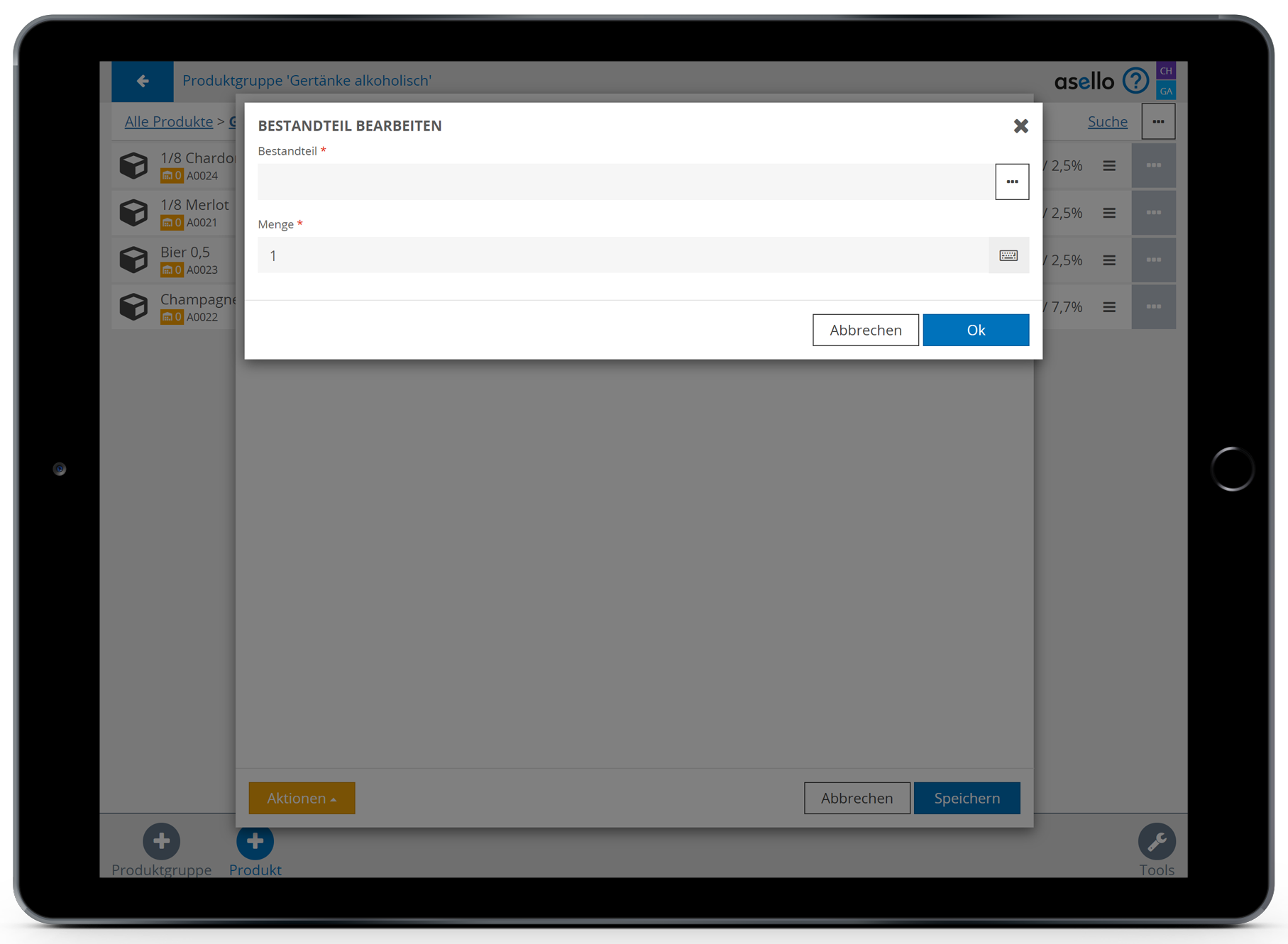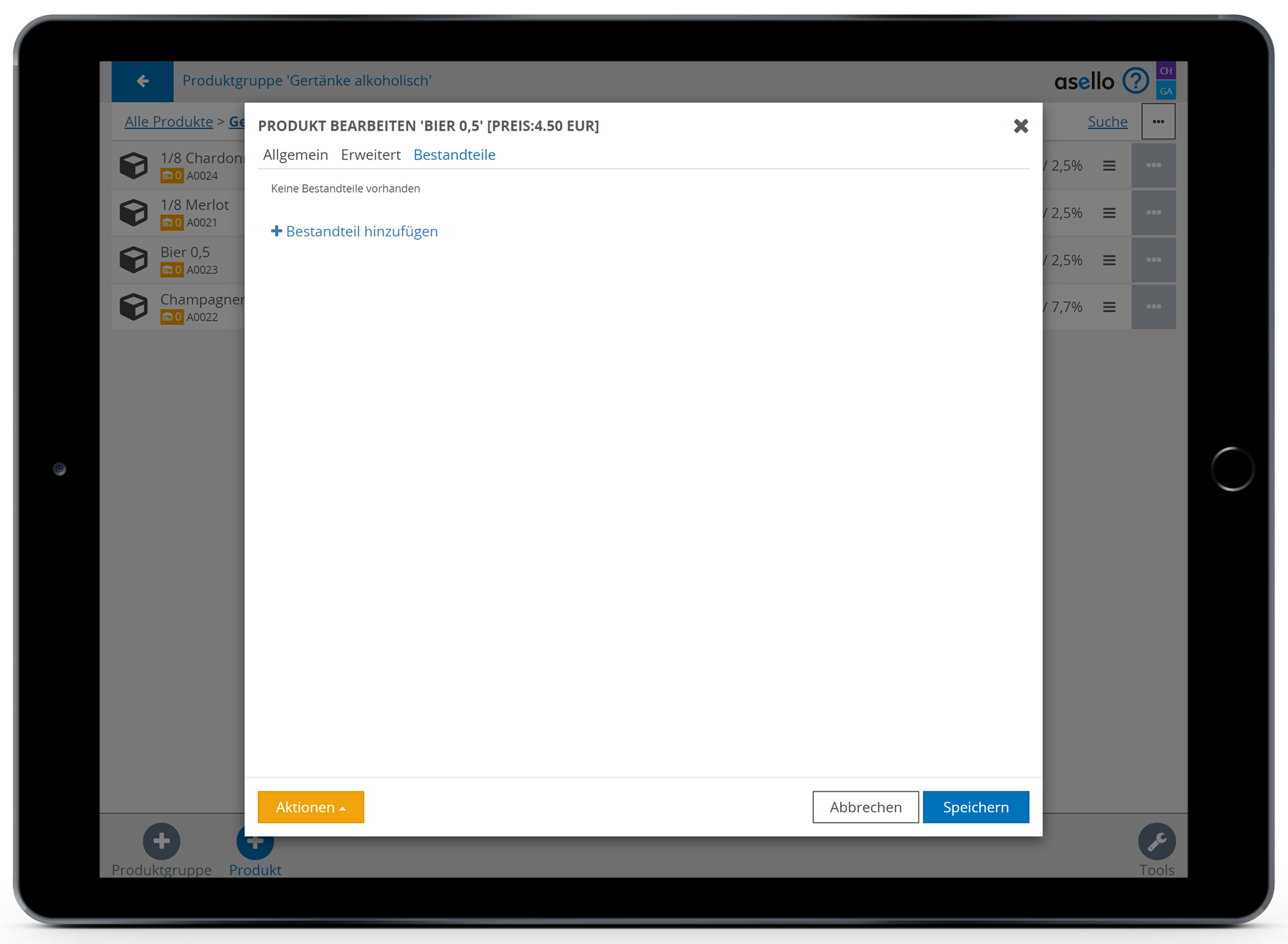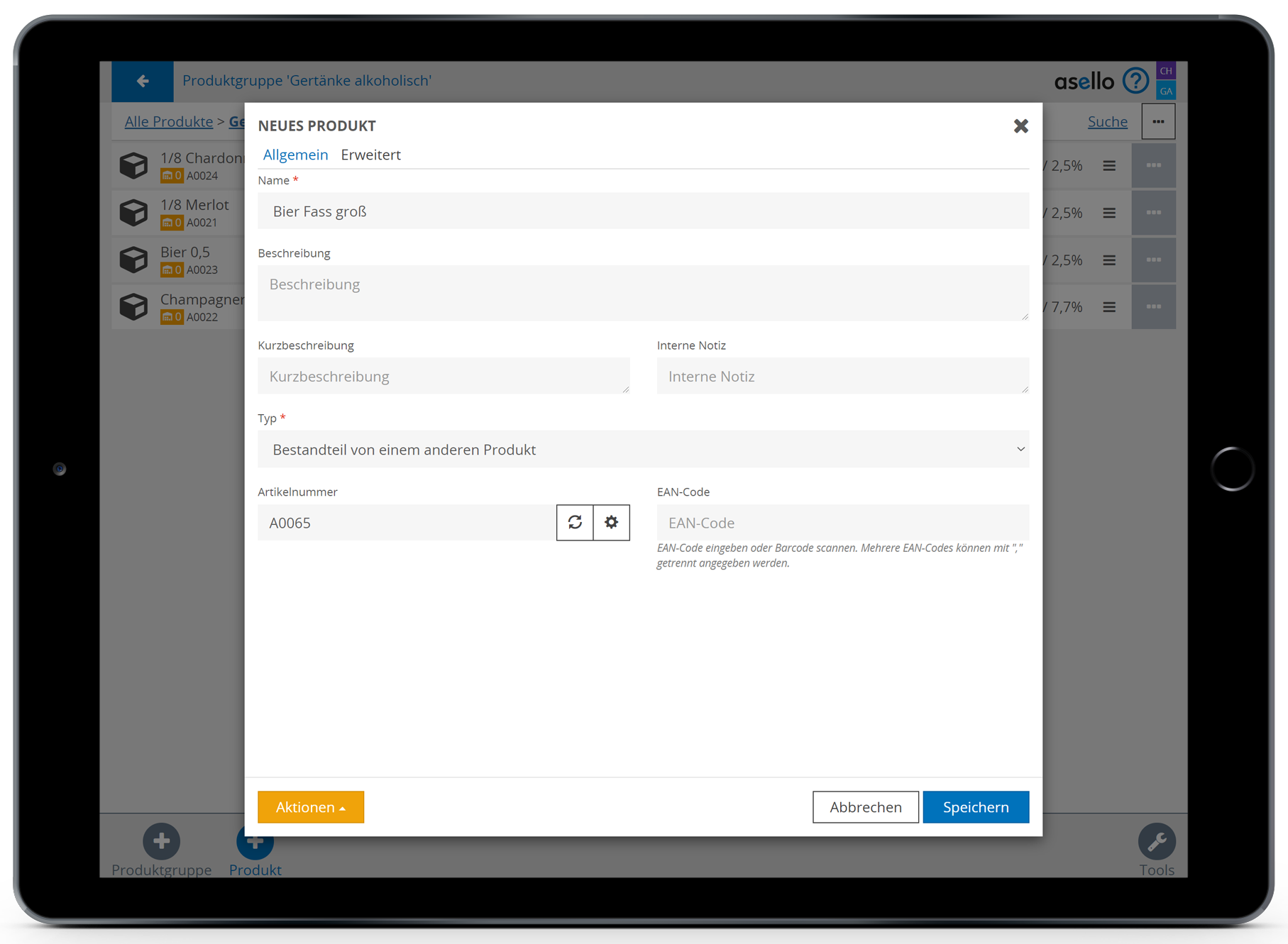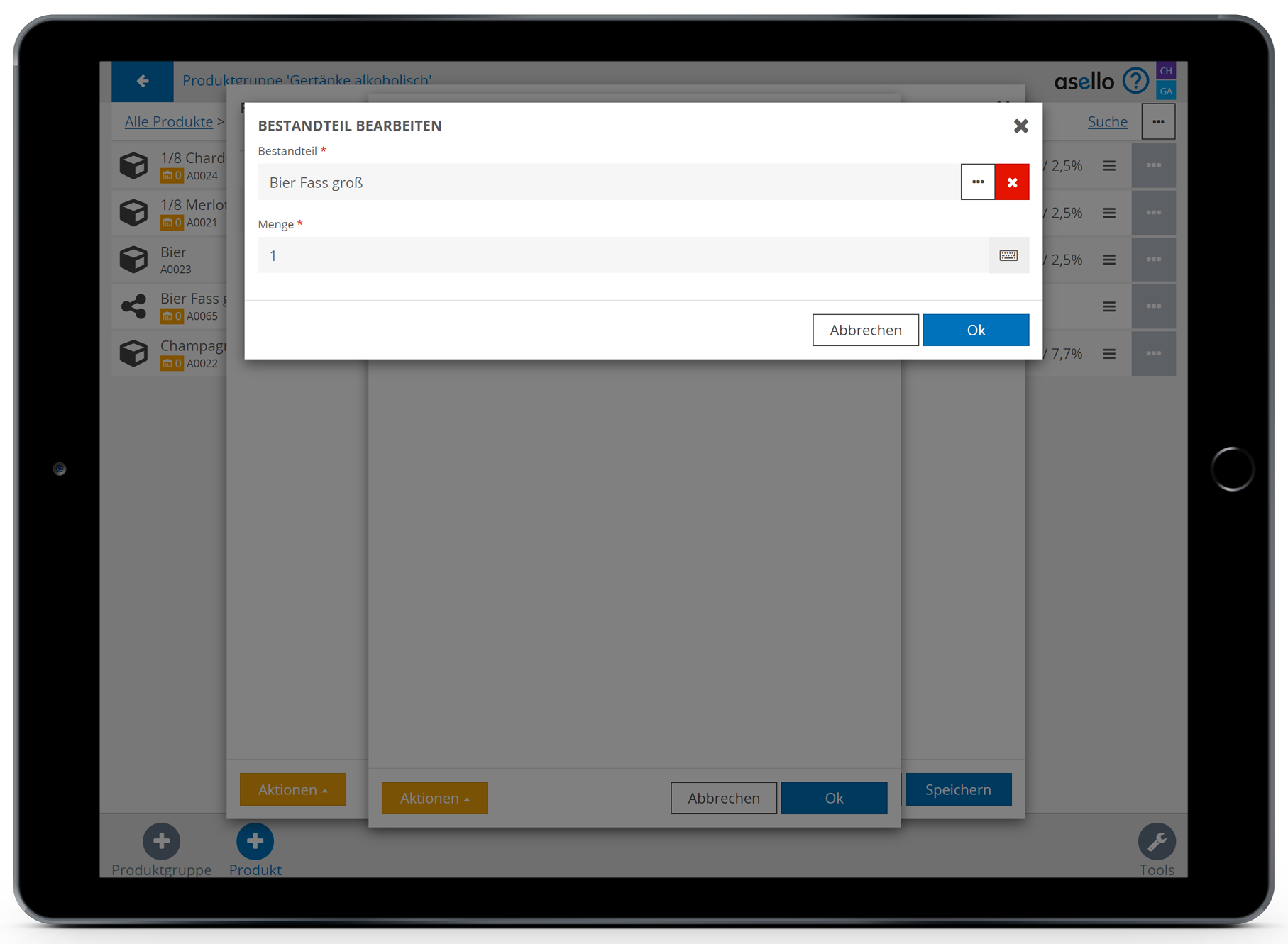 Anschließend wählen Sie das blaue Plus „Produkt“, im rechten unteren Eck, aus. Nun erscheint ein Pop-Up-Fenster, indem Sie zuerst den Namen des Bestandteiles eintragen müssen. In diesem Fall Fass Bier.