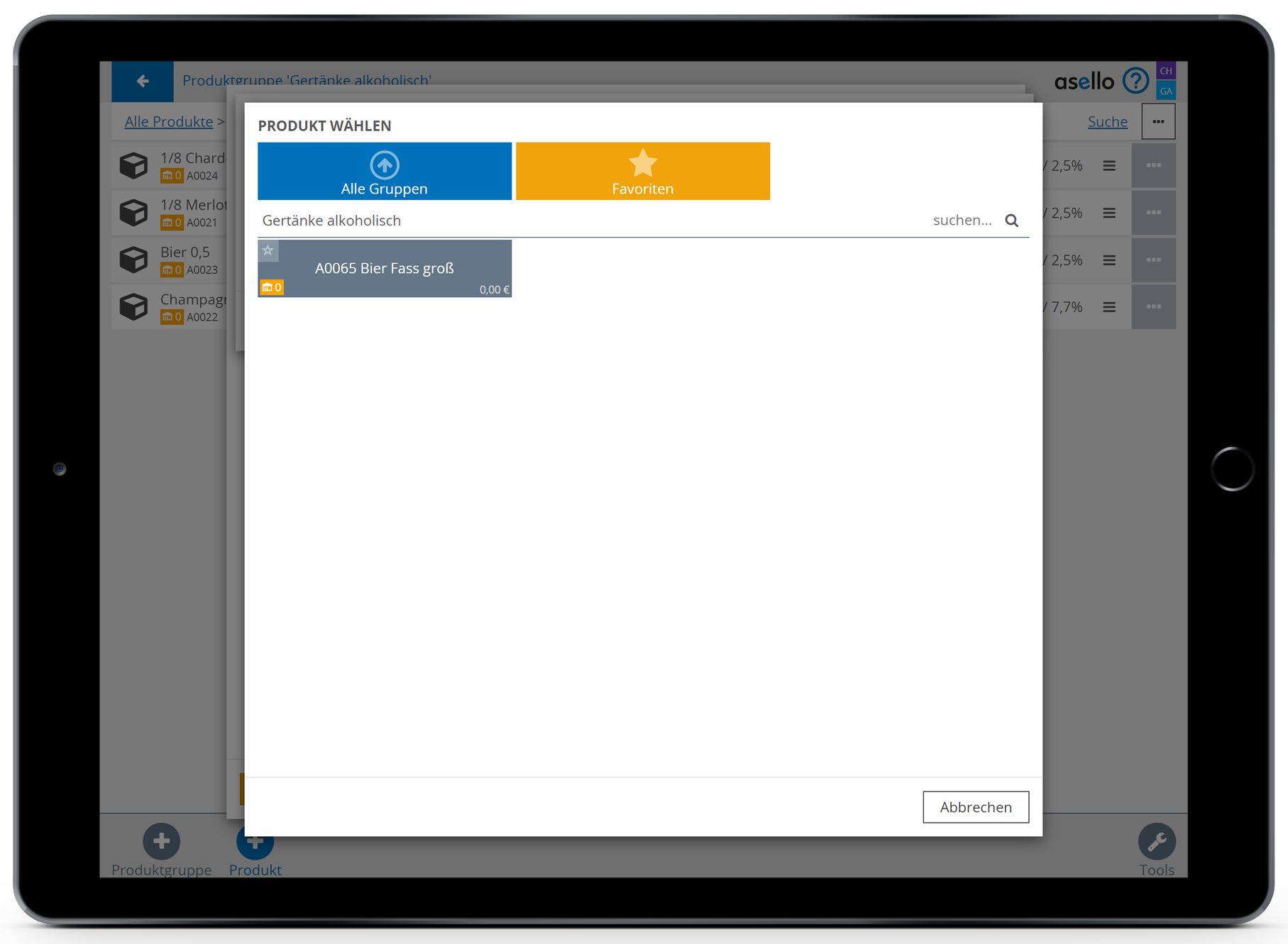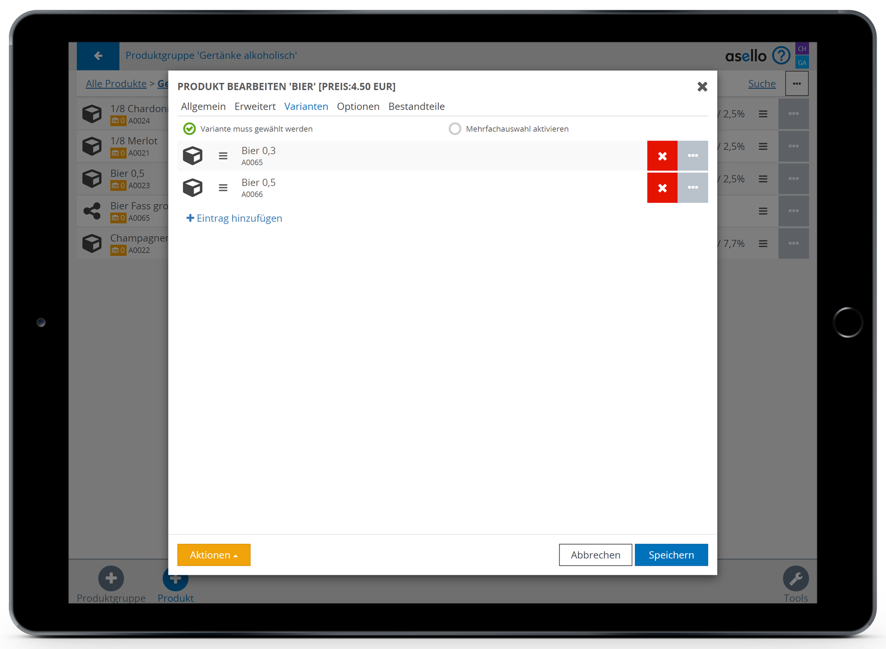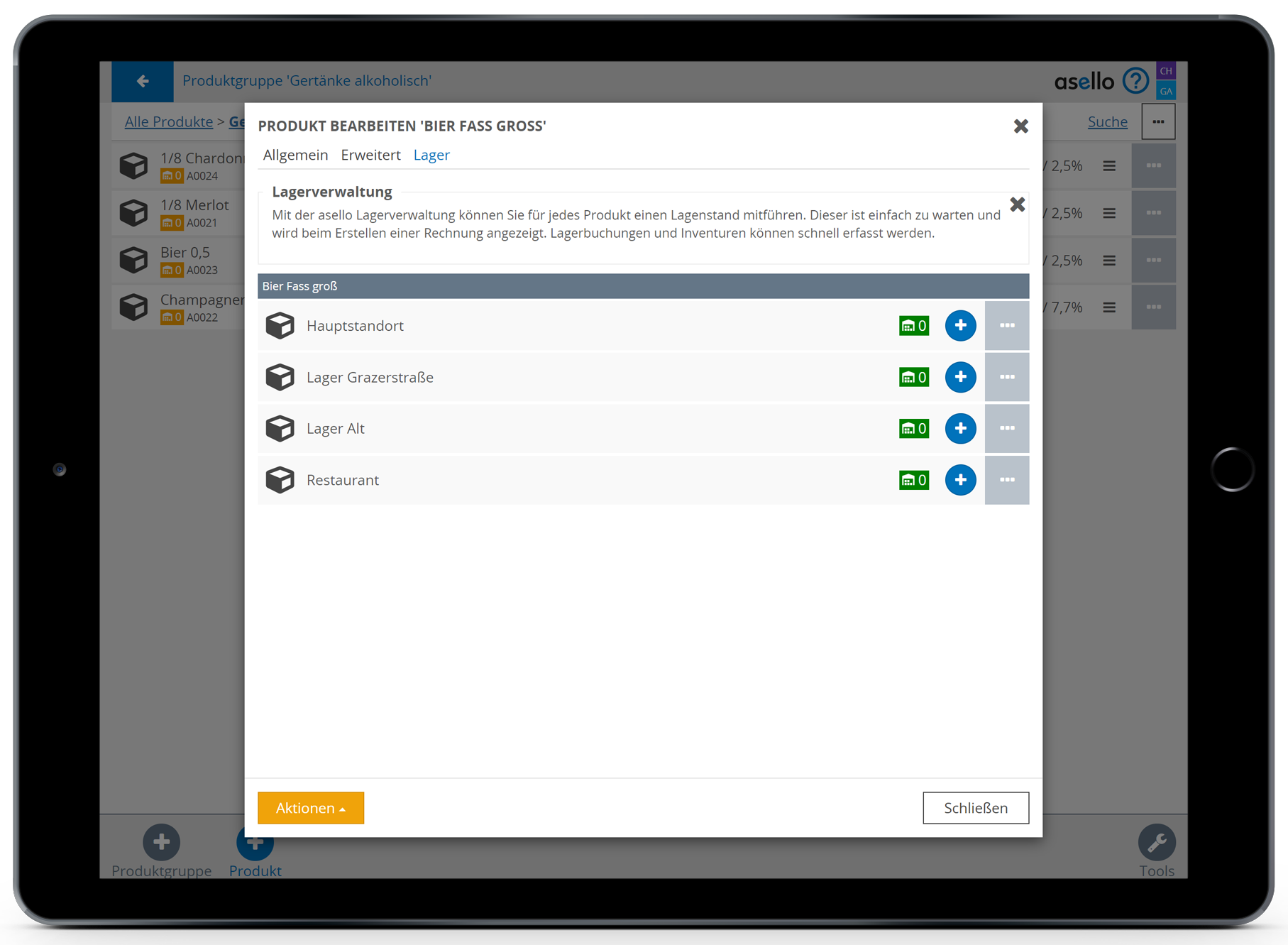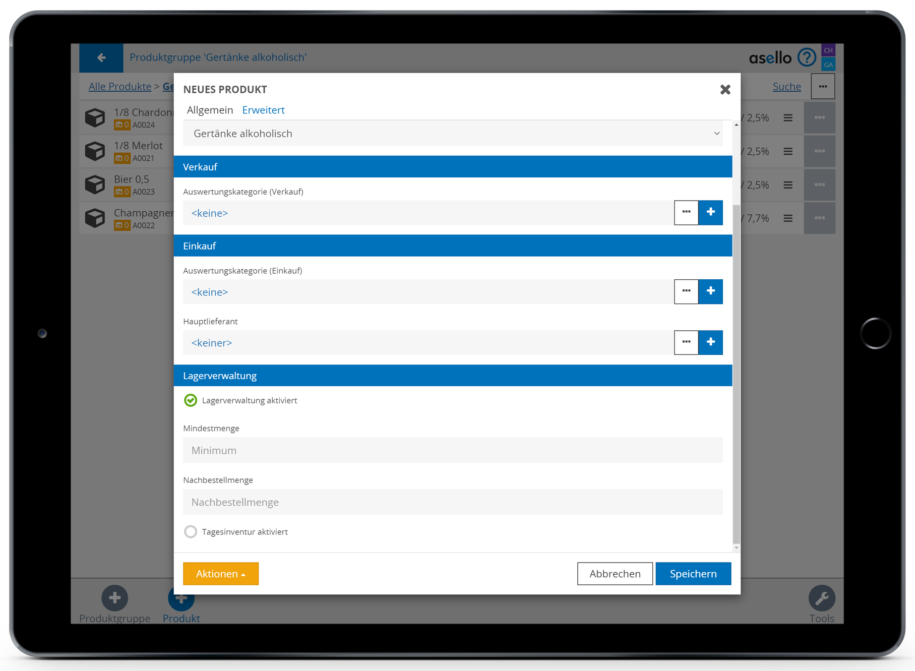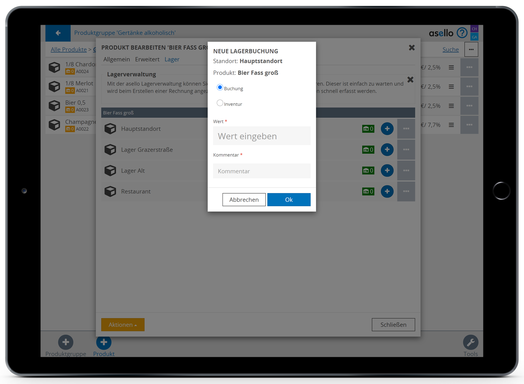 Anschließend wählen Sie das blaue Plus „Produkt“, im rechten unteren Eck, aus. Nun erscheint ein Pop-Up-Fenster, indem Sie zuerst den Namen des Bestandteiles eintragen müssen. In diesem Fall Fass Bier.
