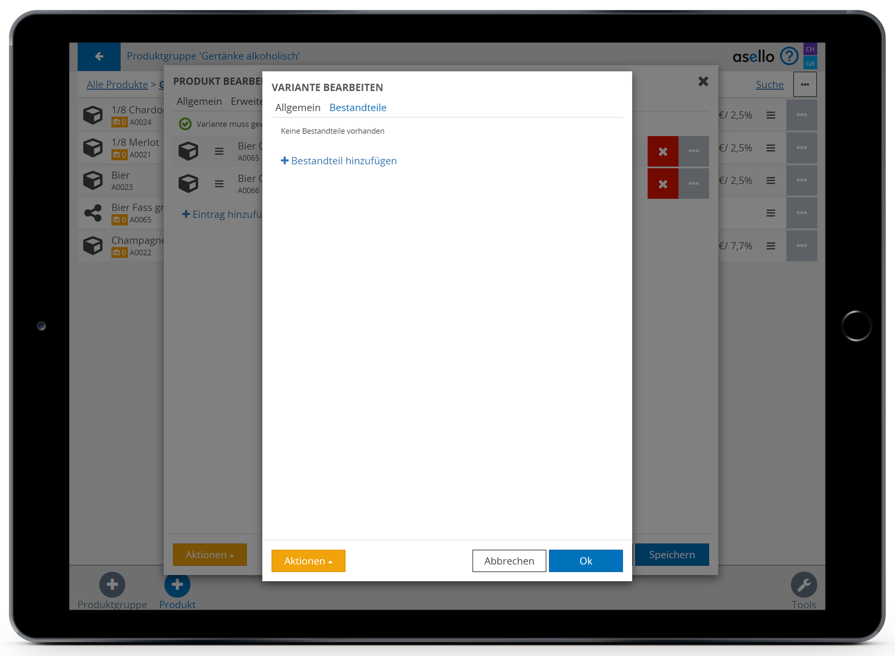 Mit Bestandteilen können Sie perfekt arbeiten, wenn Sie mit Zutaten arbeiten, die im Ganzen nicht verkauft werden oder Bestandteil mehrere Produkte sein können, aber ein zentraler Lagerstand benötigt wird. Beispiele: weiße Mischung, Wein wird aber auch 1/8 weise verkauft.
