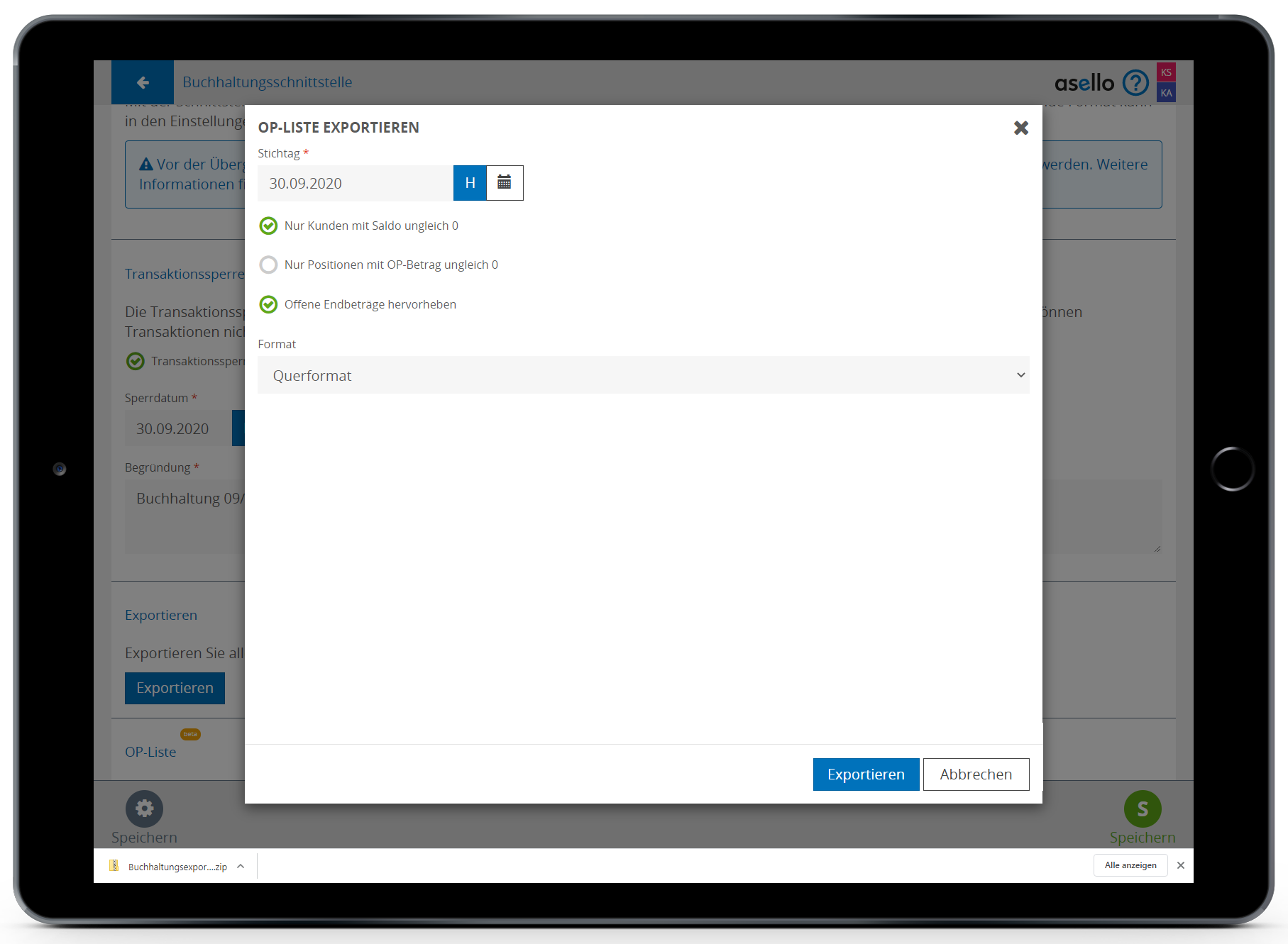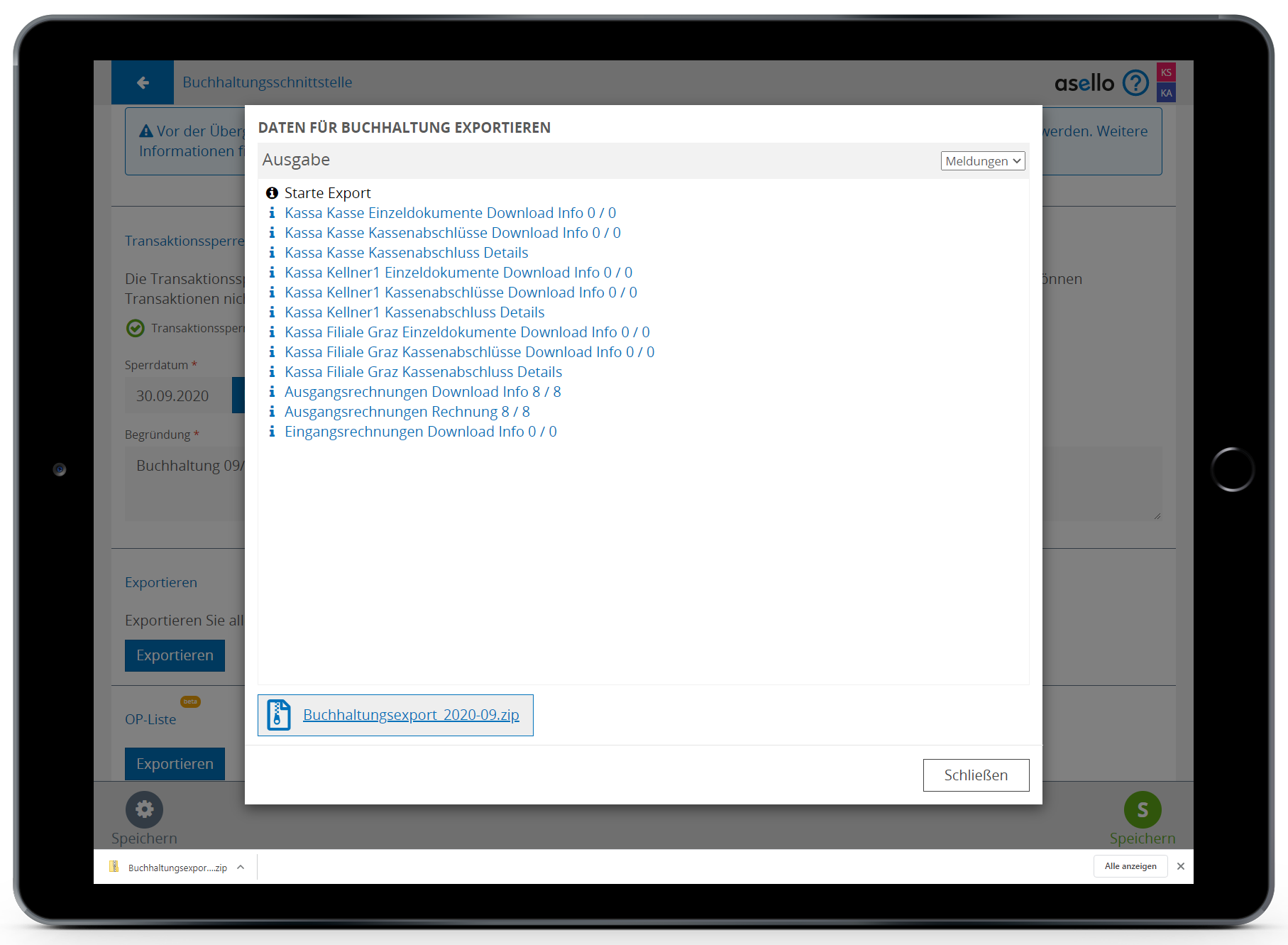 Es wird eine ZIP-Datei auf Ihren Computer heruntergeladen, die Sie an Ihren Steuerberater für die Buchhaltung übermitteln können.