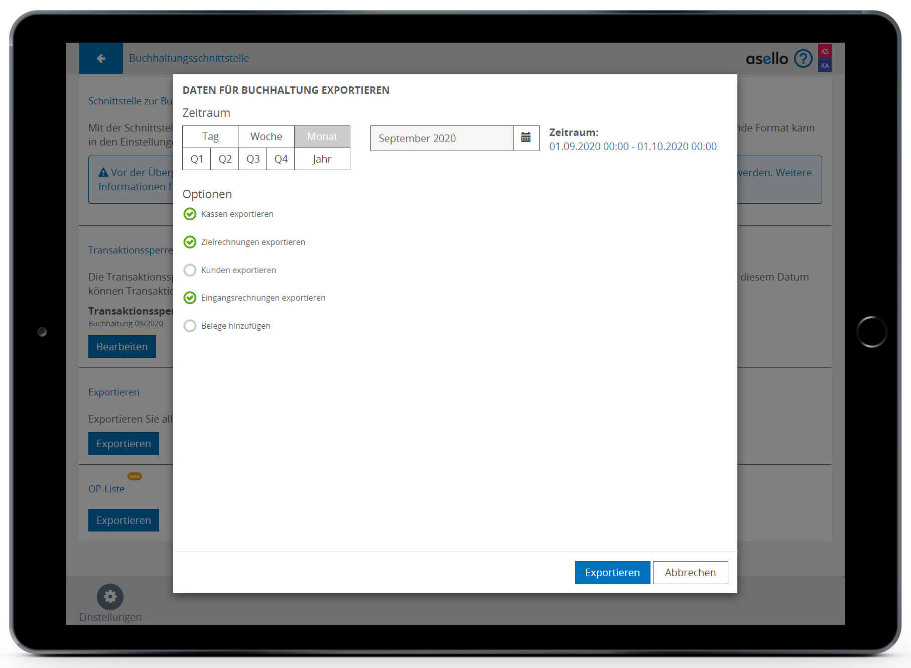 Belege hinzufügen: Dabei werden alle Belege, die in dem gewünschten Zeitraum erstellt wurden, exportiert.