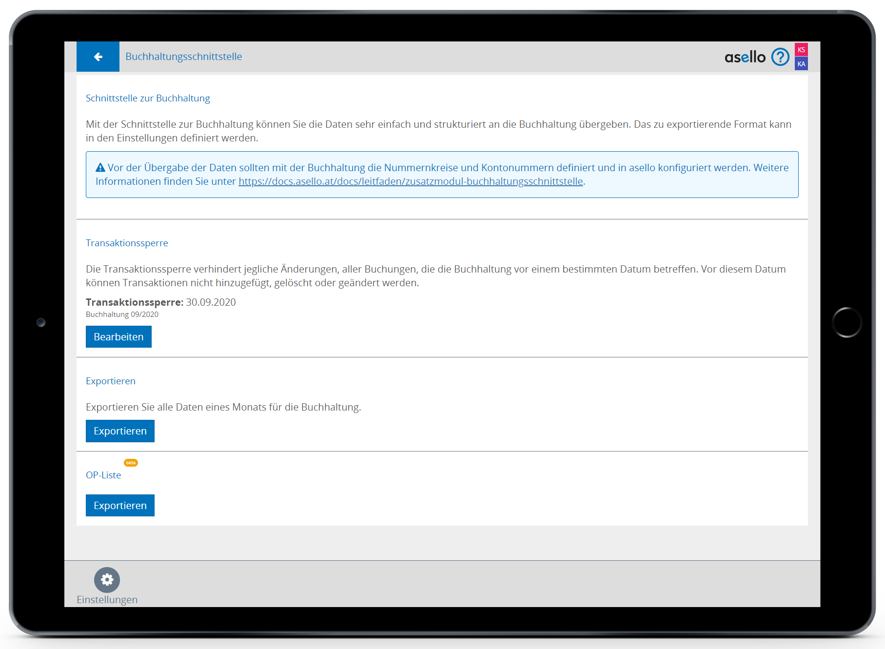 Durch Setzten eines grünen Häkchens, können Sie eine Transaktionssperre aktivieren. Die Transaktionssperre verhindert das nachträgliche Bearbeiten der Daten, die Sie bereits für die Buchhaltung exportiert haben. So müssen Sie im Nachhinein nicht mehr überprüfen ob sich Daten geändert haben, da dies nicht mehr möglich ist. Sie können dafür den genauen Tag festlegen.
