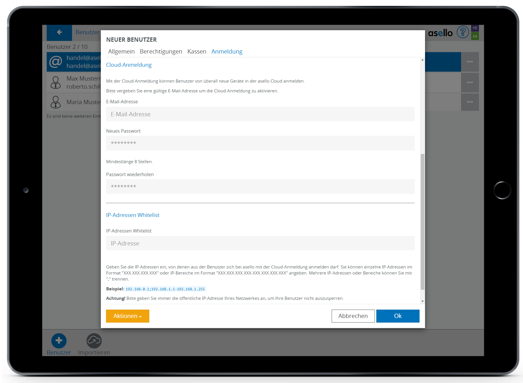 Klicken Sie auf den Benutzer, für den Sie die Cloudanmeldung aktivieren möchten. Anschließend klicken Sie auf die Registerkarte „Anmeldung“. Im Unterpunkt „Cloud-Anmeldung“ tragen Sie nun die E-Mail-Adresse und ein Passwort, welches Sie unterhalb wiederholen müssen, für den Benutzer ein. Beachten Sie, dass das Passwort mindestens achtstellig sein muss und die E-Mail-Adresse in asello nur einmal verwendet werden darf. Abschließend klicken Sie auf den blauen Button „OK“ im rechten unteren Eck, um die Daten zu speichern.