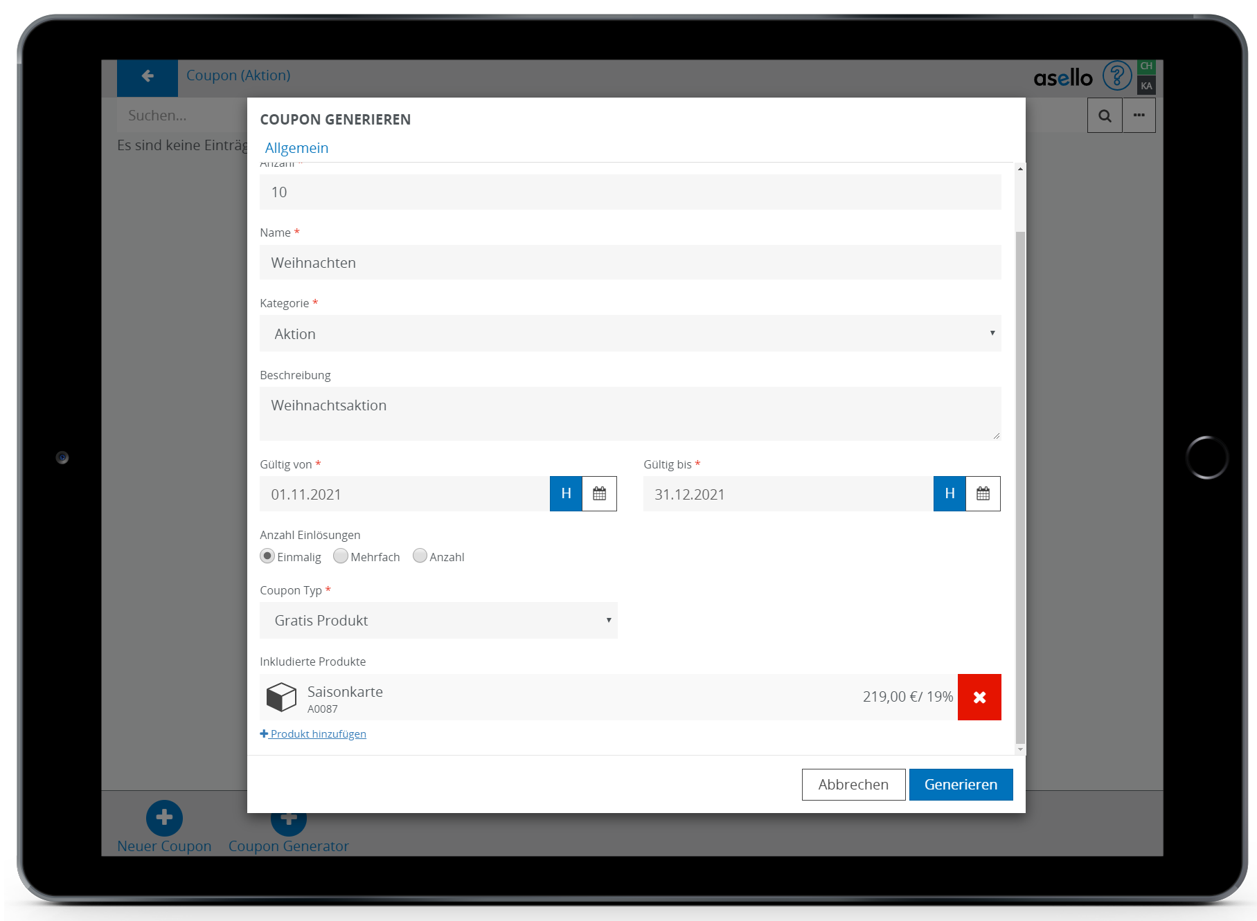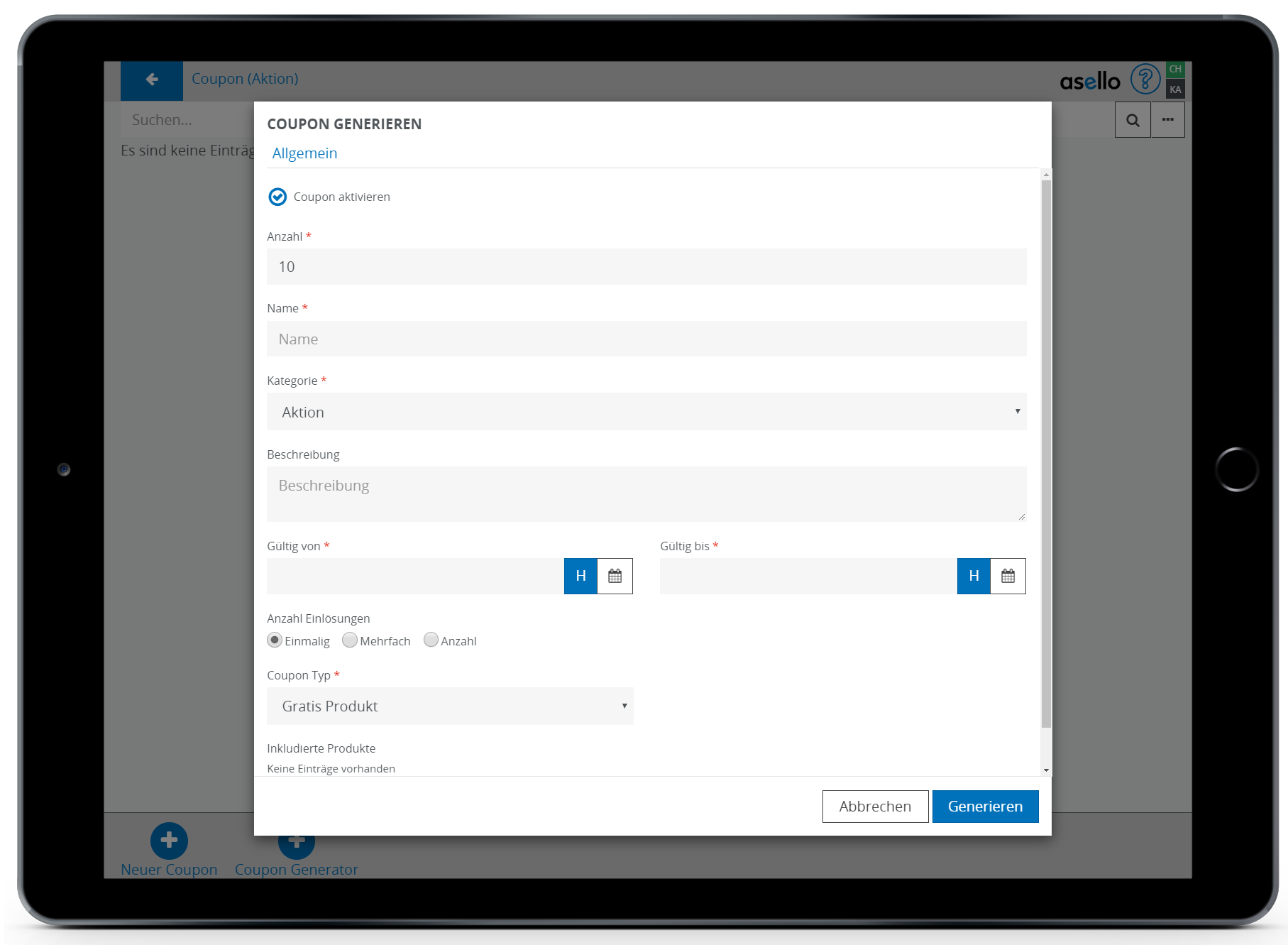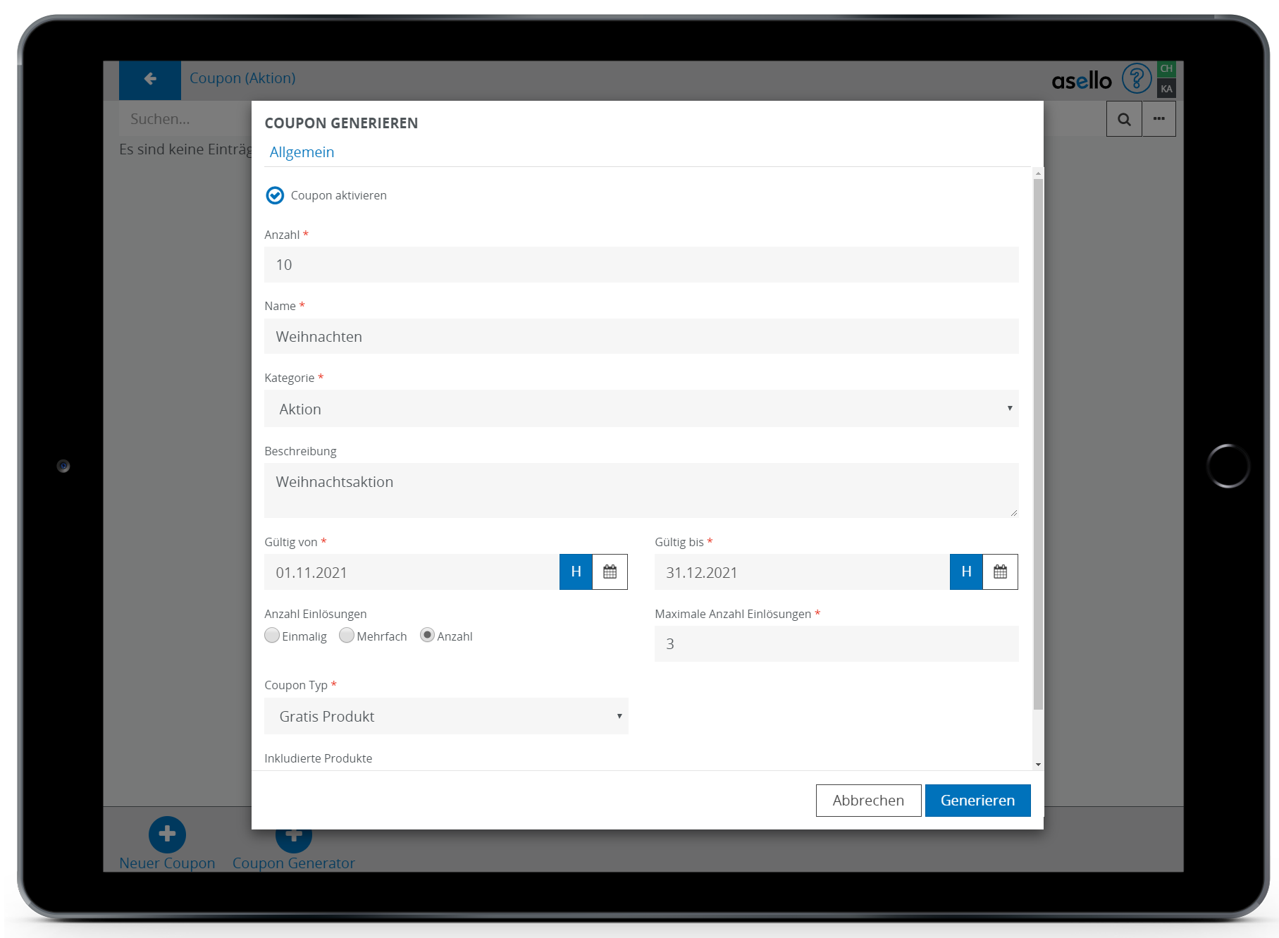 | Anzahl | Der Coupon kann maximal zu der von Ihnen defineirten Anzahl eingelöst werden. |
