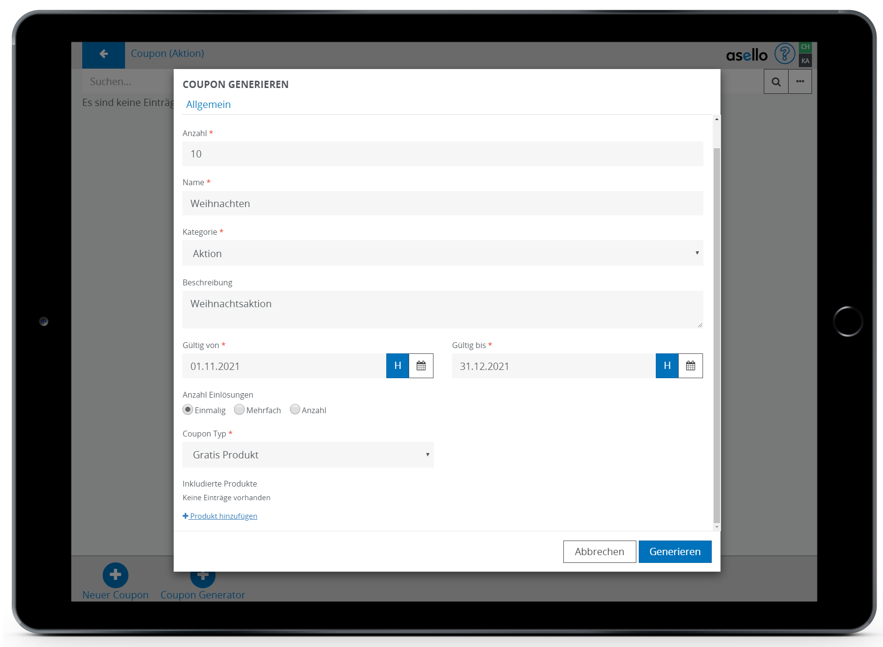 Anzahl | Der Coupon kann maximal zu der von Ihnen defineirten Anzahl eingelöst werden. |