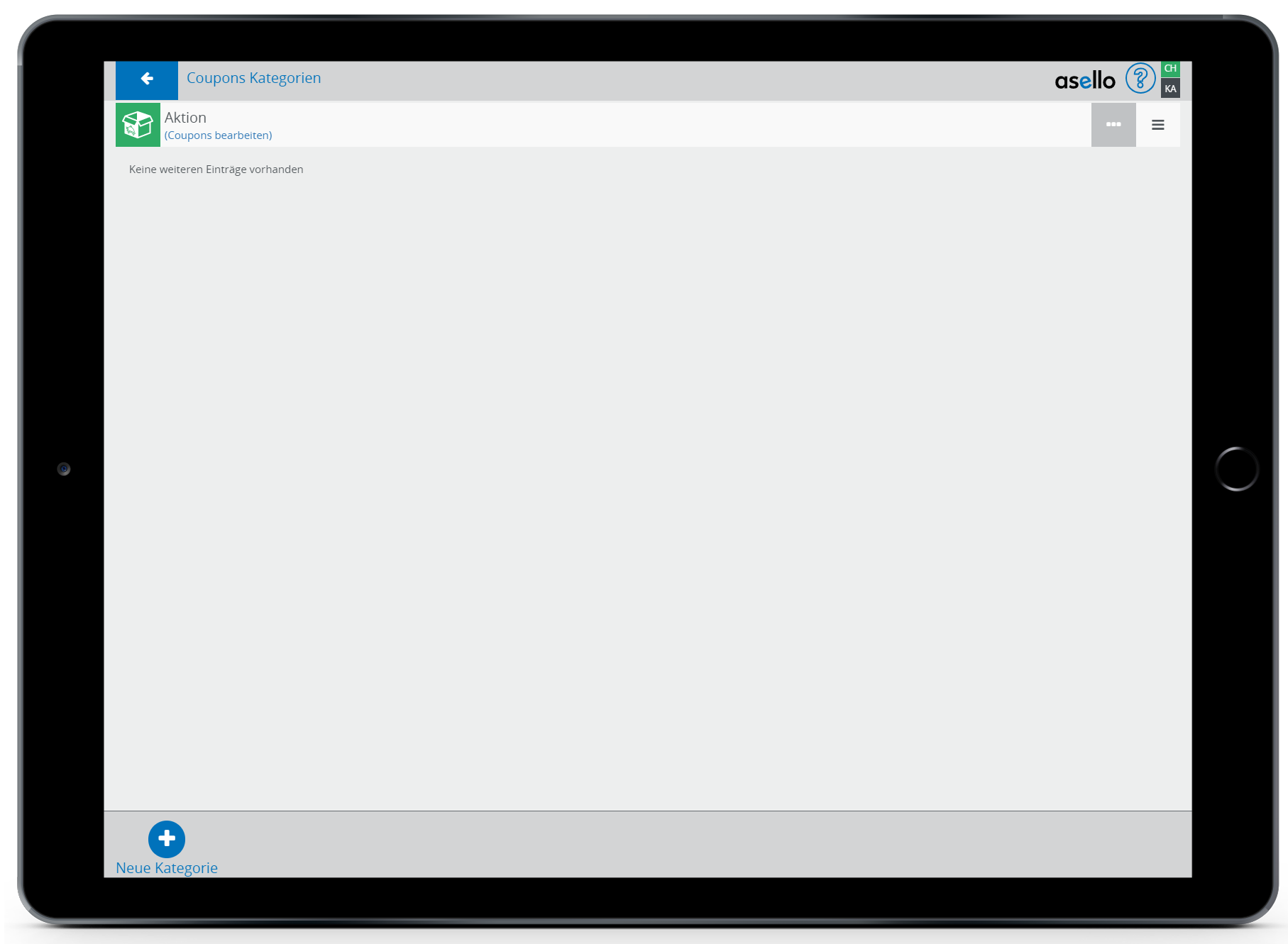 Nun erscheint die Seite "Coupons Kategorie", auf welcher Sie Coupon Kategorien und Coupons erstellen können. Um eine neue Coupon Kategorie zu erstellen, klicken Sie auf den blauen Button Plus " Neue Kategorie".