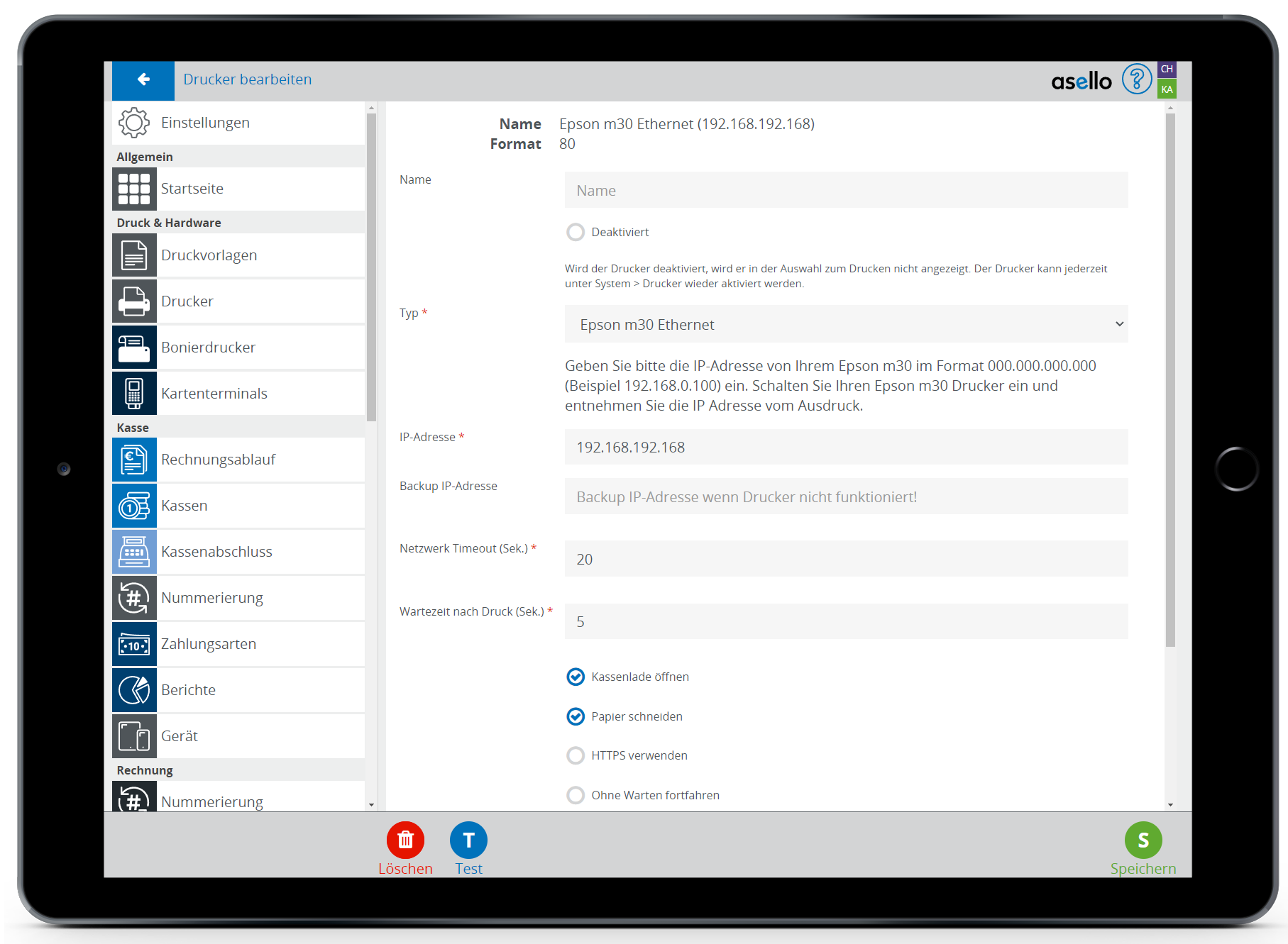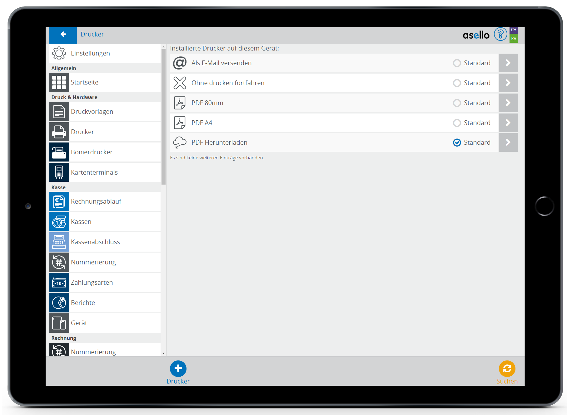 Im Bereich „Drucker“ finden Sie alle Drucker, mit denen Sie aus asello drucken können. Diese Einstellung muss pro Gerät konfiguriert werden. Um zu dieser Konfiguration zu gelangen, klicken Sie auf der asello Startseite auf die graue Kacheln "Einstellungen" und wählen anschließend "Drucker" auf der linken Seite aus.